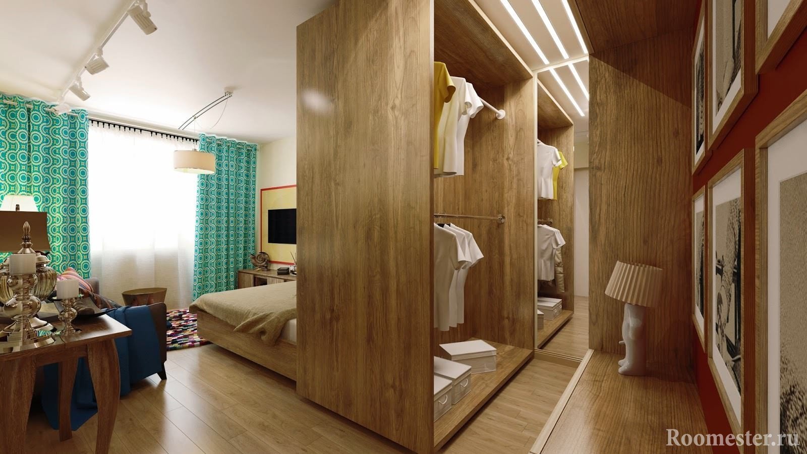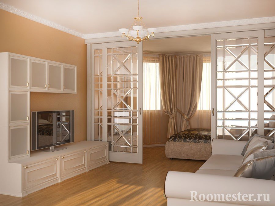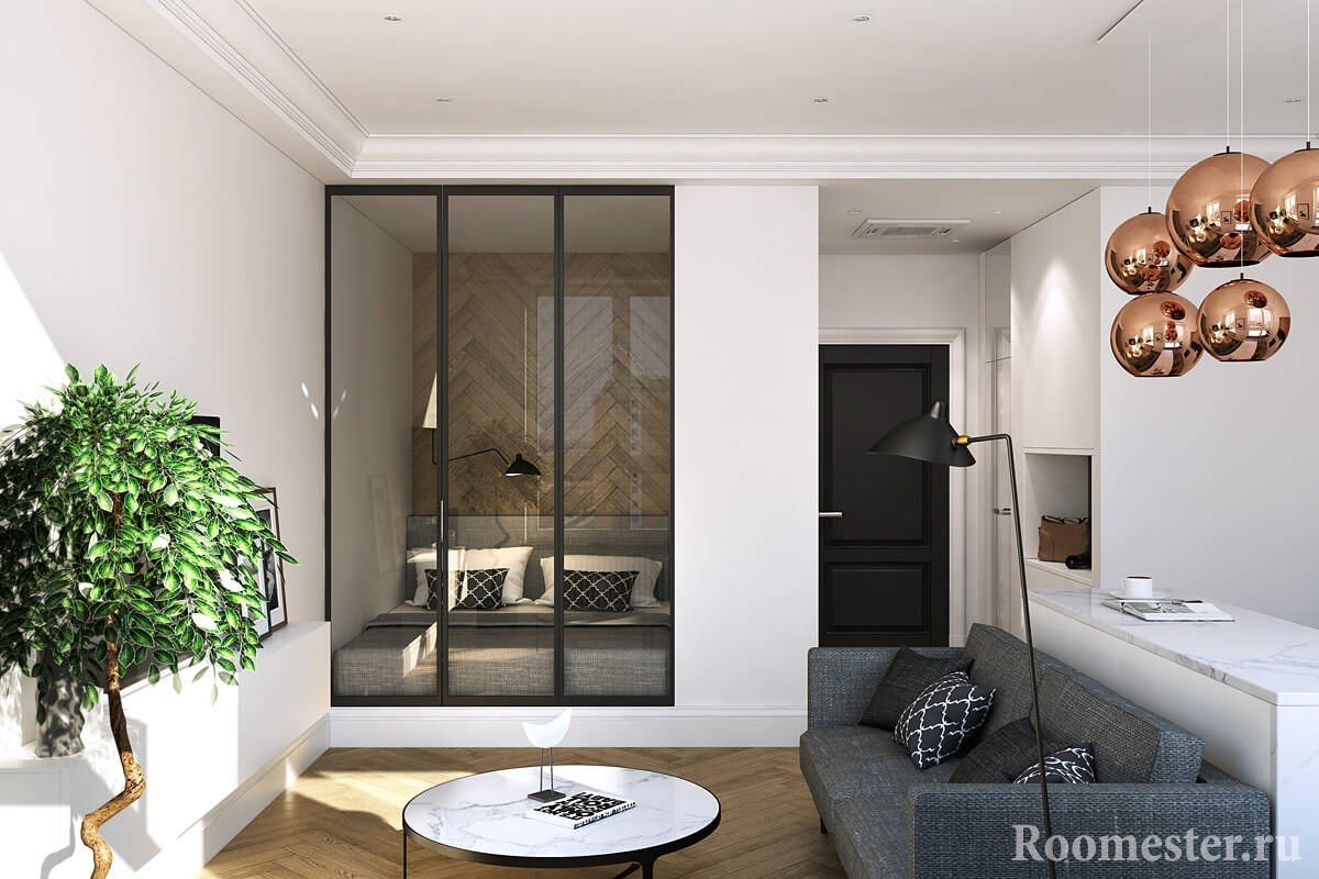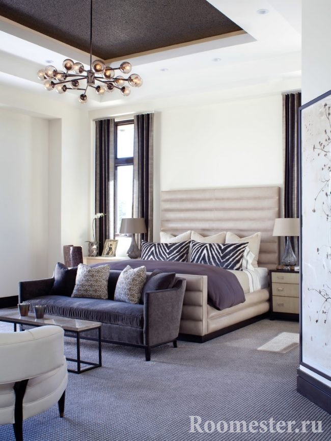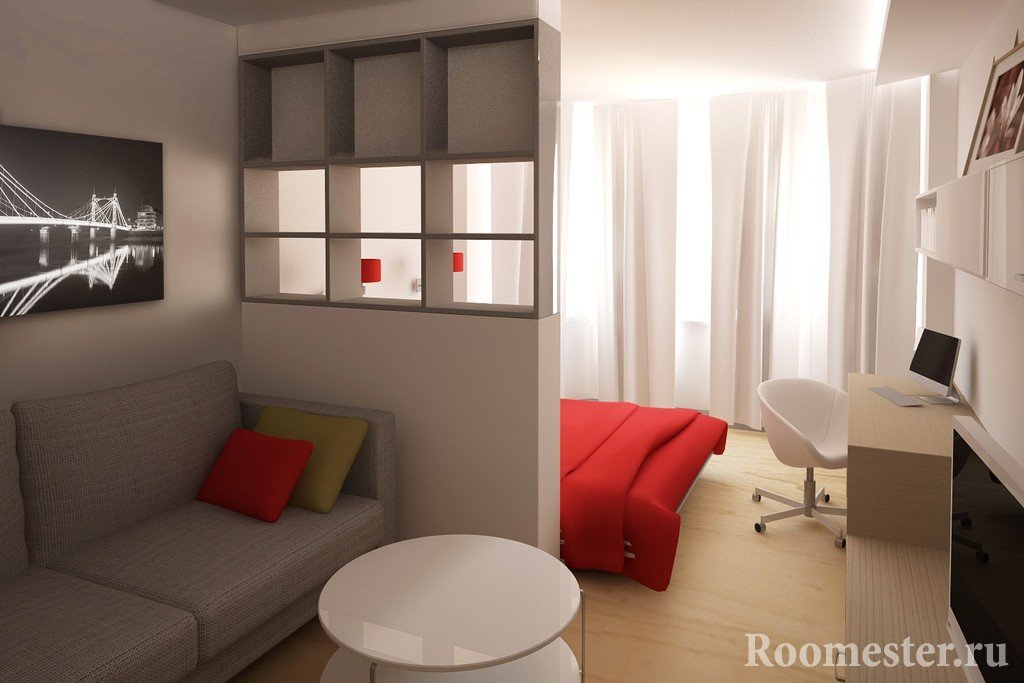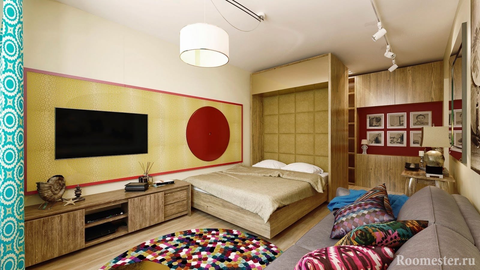 Encontrar un compromiso en la disposición de los muebles es una tarea más urgente que elegir un estilo. La ausencia de particiones no siempre es la mejor opción, aunque en este caso el volumen visual se conservará por completo. Un modelo de cama lacónica con textiles a juego en las paredes no se destacará.