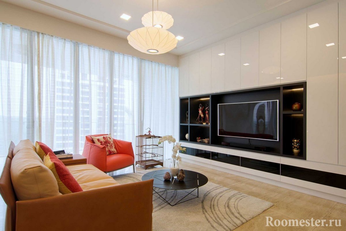 Armarios flotantes integrados como alargados y no voluminosos. Para cada estilo, sus fachadas son diferentes. Para los modernos, con un sesgo hacia el minimalismo, tienen fachadas brillantes, a menudo de MDF, sin asas visibles.Dichos elementos crean una sensación de integridad, respaldan una concisión general y permiten que el televisor esté en su lugar.