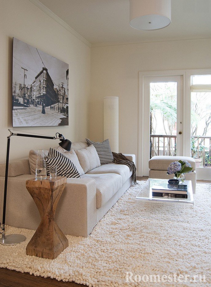 Los paneles de madera pueden hacer frente a la zonificación condicional, y en algunos proyectos de diseño se utiliza un revestimiento de piso para una pared, por ejemplo, un laminado o un tablero de parquet. Sin lugar a dudas, para el piso puede elegir un material más presupuestario, por ejemplo linóleo con una hermosa alfombra que distrae en el centro. Este método, como muestra la práctica, en presencia de niños pequeños y mascotas, es óptimo desde el punto de vista de la limpieza, resistencia al desgaste (susceptibilidad a los rasguños).
