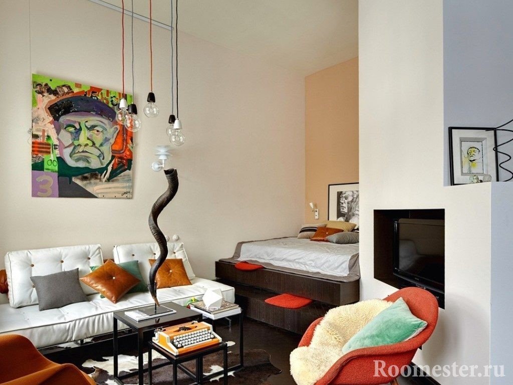 En la realidad de la falta de medidores, cuando no solo se necesita un grupo suave para relajarse en la habitación, sino también una oficina, un comedor o un área para dormir, la iluminación está cuidadosamente pensada. Una variedad de escenarios son útiles durante la operación y delimitar un área pequeña. El tipo de techo depende de esto, aunque los diseñadores recomiendan que se haga blanco y simple, pero se puede hacer de diferentes maneras.
