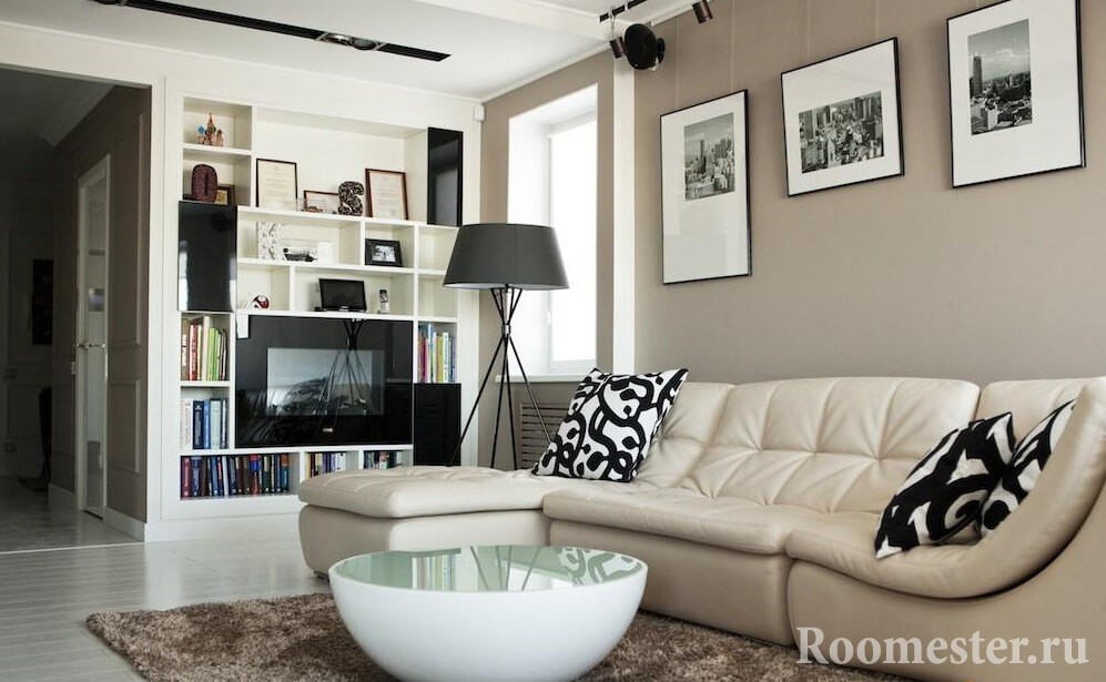 Todo esto es muy importante, solo habiendo determinado la prioridad, puede hacer la disposición de los muebles. Es mejor dividir inmediatamente la habitación en zonas: con muebles tapizados, espacio de almacenamiento y un televisor. Vale la pena agregar un estudio, un rincón compacto y acogedor con un lugar cómodo, un escritorio de computadora, un par de estantes para libros.