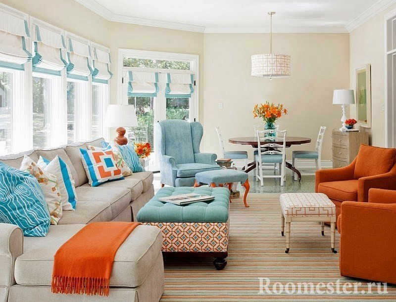 Para salas de estar pequeñas, es mejor poner un sofá, pero si los tamaños lo permiten, sillas, pufs.