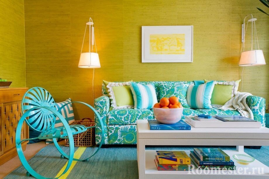 Para los muebles tapizados, hay algunas excepciones, puede mezclarlas con el diseño, por ejemplo, un simple sofá loft más sillones en colores brillantes, como EggChair o Pola.