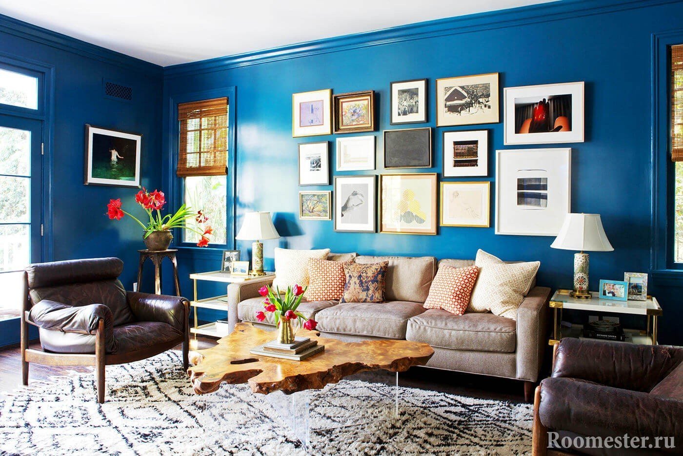 La decoración se puede colocar en las paredes, en forma de marcos con fotos familiares, un árbol genealógico pintado en la pared. La disposición moderna generalmente "ama" la pintura de las paredes, ya sean patrones, un adorno para acentuar una parte de la sala de estar o toda la pared llena de pintura. Por cierto, con la ayuda de la pintura, puede dividir visualmente las habitaciones en zonas, discretamente y bellamente. Los clásicos o neoclásicos se complementan con pinturas en baguettes de lujo, con una interpretación moderna que puede retroceder un poco, decorar las paredes con baguettes de poliuretano en el techo, destacando así un soporte de TV con un televisor, una abertura de ventana o una pared vacía.