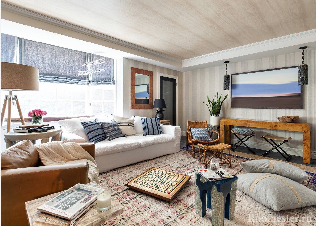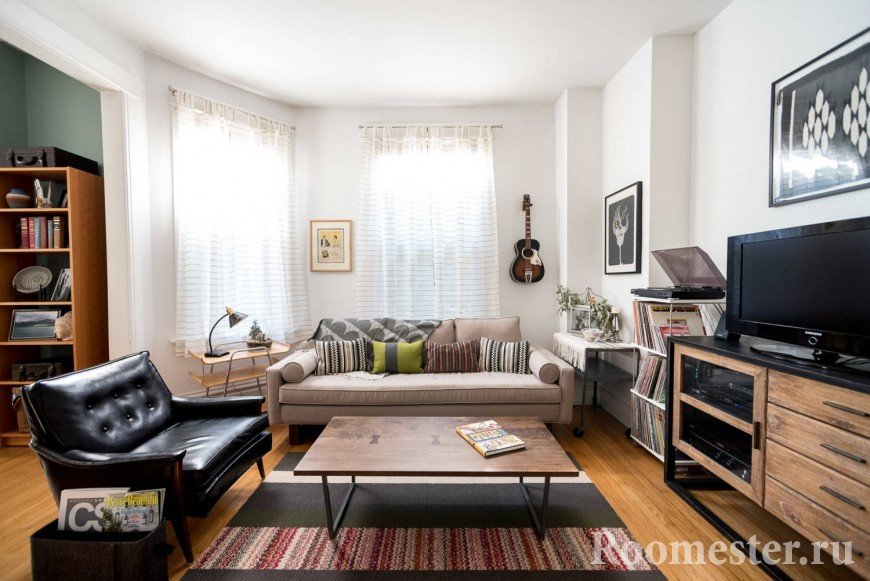 El interior de la sala del apartamento se puede hacer en fusión, tomando como base los clásicos. Los muebles de madera clara, los tonos relajantes en la decoración se combinan perfectamente con la decoración del país africano: patrones textiles brillantes y reconocibles, almohadas en blanco y negro, figuras, lámparas hechas de materiales naturales.