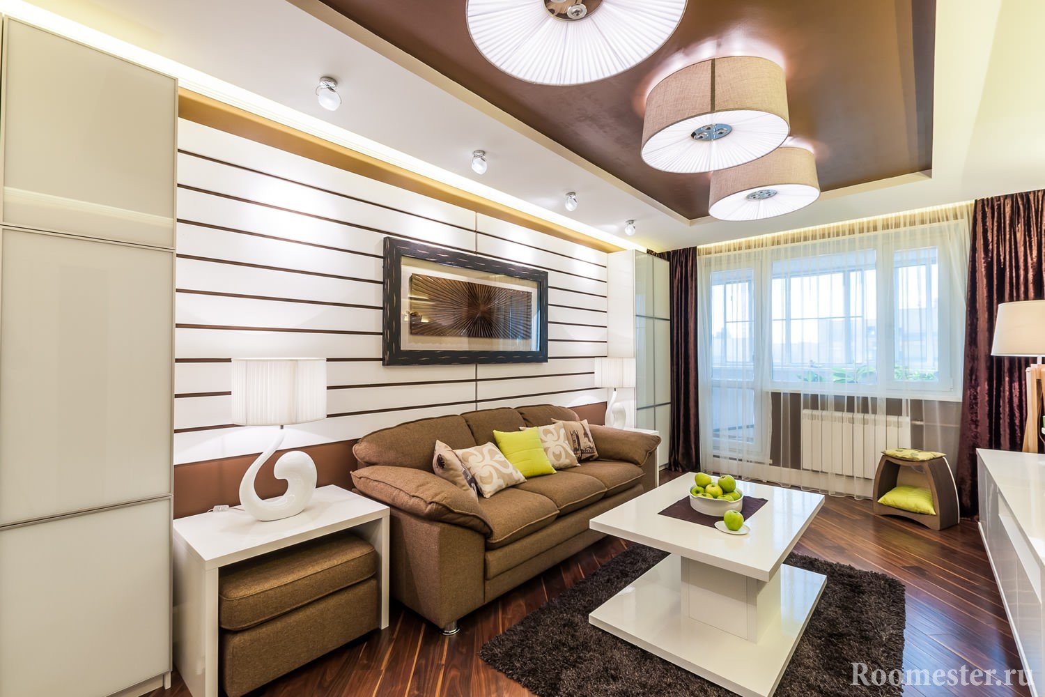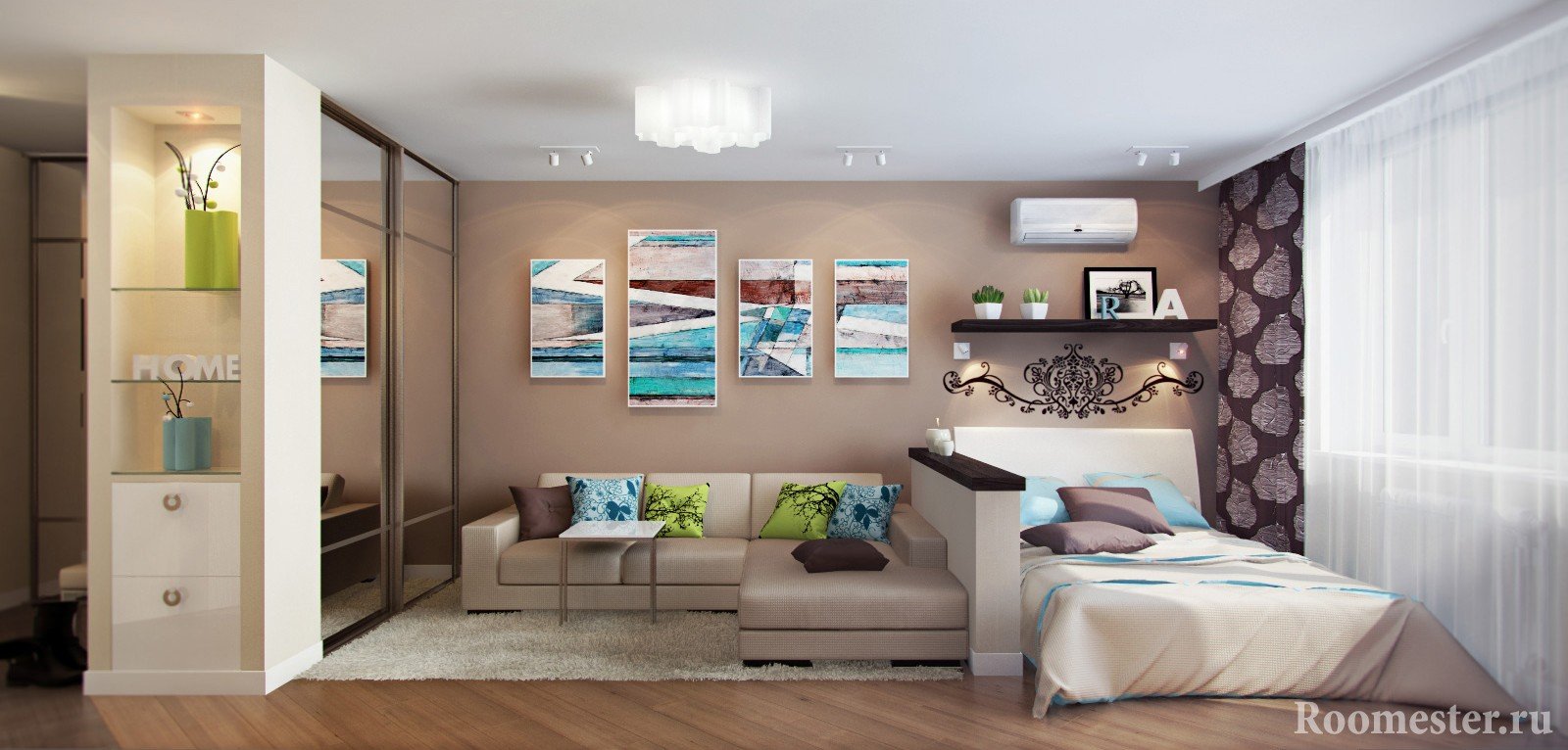 Área de televisión, preferiblemente frente a una pared en blanco, con un sofá loft. Es bastante fácil colocar un armario grande para guardar cosas, ropa de cama. No te olvides de las plantas vivas, una o dos macetas en el piso a ambos lados del soporte de la televisión es la mejor solución. Da preferencia a esos tipos de plantas que crecen verticalmente, no interfieran con el libre movimiento de la habitación. Decoración para el salón, en el mejor de los casos, cuadros o paneles, colocados en una pared libre junto al sofá.