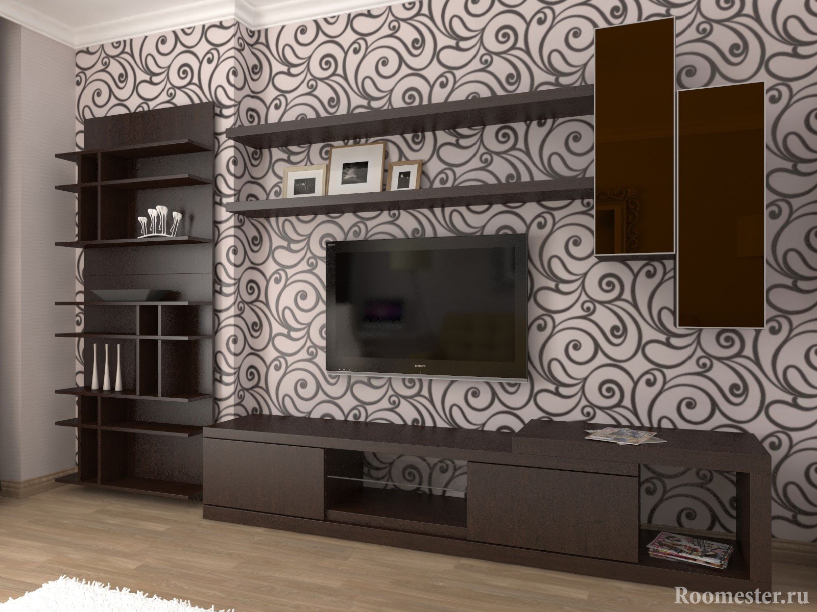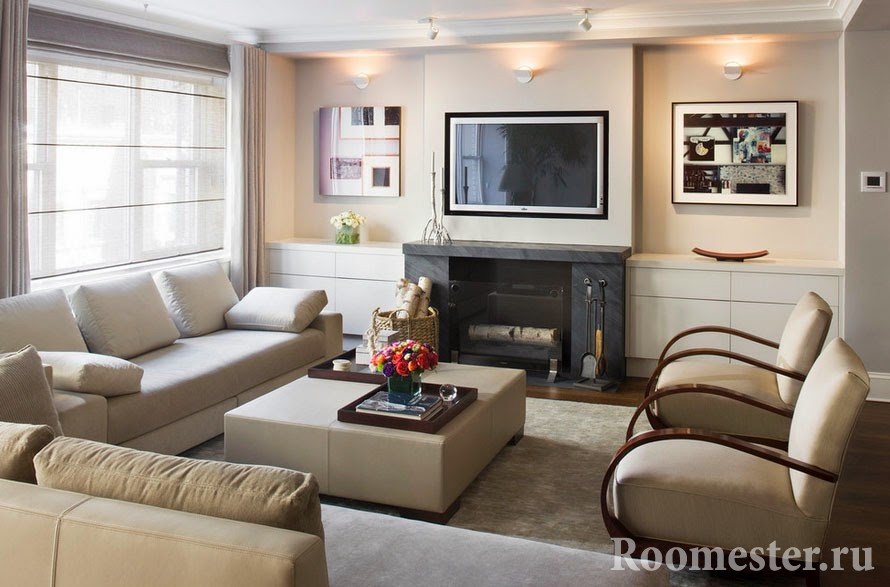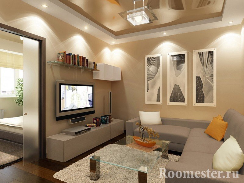 Una habitación con un diseño cuadrado se puede construir con una simetría estricta, un sofá, dos sillones a ambos lados, un soporte de TV simple, pero un armario para ropa y otras cosas se pueden reemplazar con gabinetes modulares. Muchos no tienen suficiente espacio de almacenamiento; llene una pequeña pared con gabinetes.