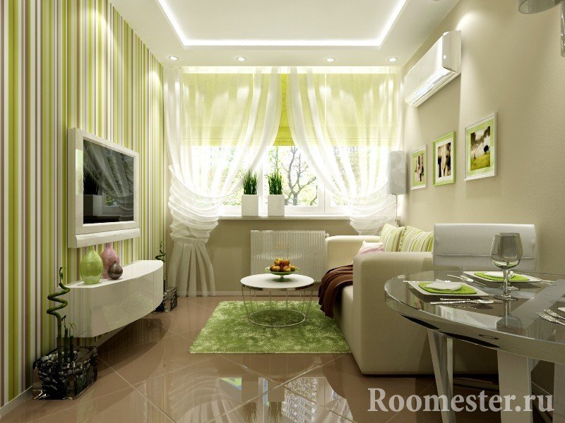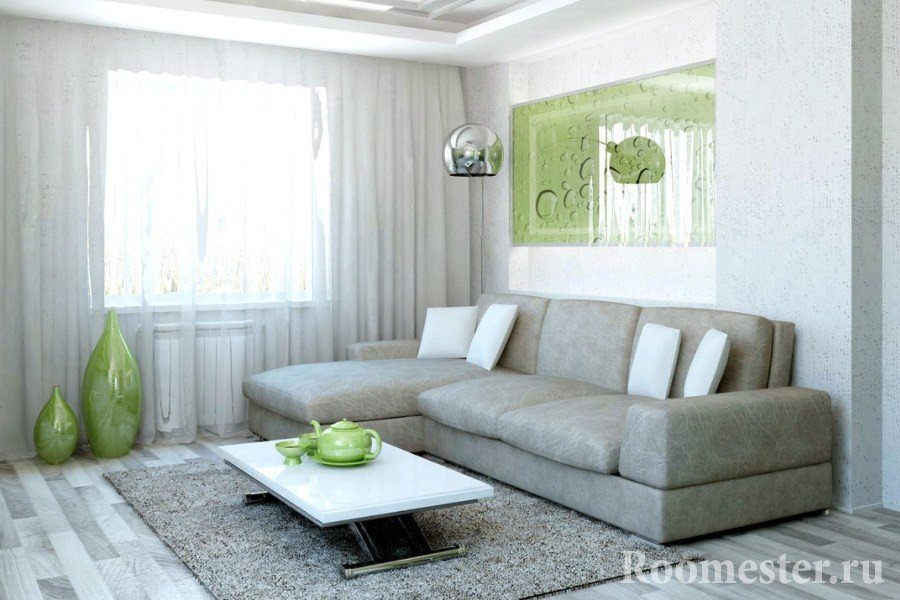 Además, el minimalismo es la única salida si la sala es de 3 por 5, el diseño de este estilo ayudará a delimitar el espacio, agregar ligereza y ligereza. Es suficiente agregar un poco de líneas suaves, el espacio tomará la apariencia de Art Nouveau. Al considerar la reorganización, tenga en cuenta todos los factores de la vida de la sala, el propósito, la iluminación natural.