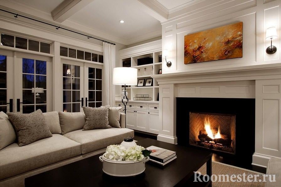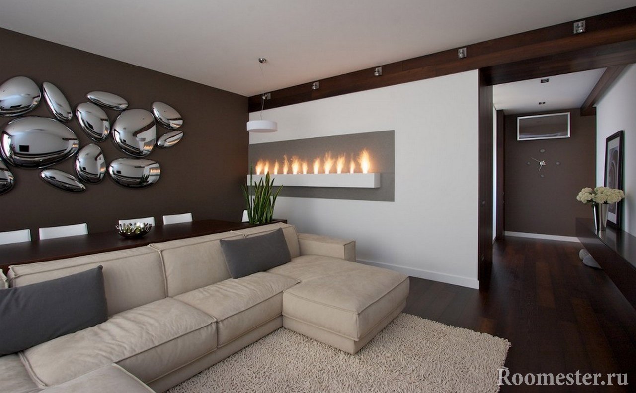 El diseño de la sala en una casa privada puede incluir una chimenea. Asegúrese de separar estas zonas, no construya una chimenea debajo del panel, reserve una esquina separada para ello, en otra parte de la habitación.