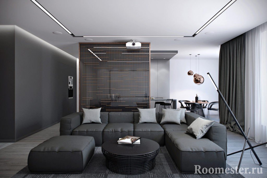 Las habitaciones que dan al lado sombreado de la casa no deben quedar ocultas por tabiques densos, mejores paneles tallados translúcidos. El sofá de esquina transformador con una litera adicional se resuelve perfectamente. Al mismo tiempo, las paredes están decoradas con un tono beige mate, los acentos son estanterías modulares. Como regla general, todas las salas de estar tienen una ventana, o una ventana con acceso a un balcón, una logia. Con las capacidades técnicas de la casa, se pueden combinar dos espacios para organizar un área de trabajo: una mesa de computadora con una silla y un par de estantes colgantes.