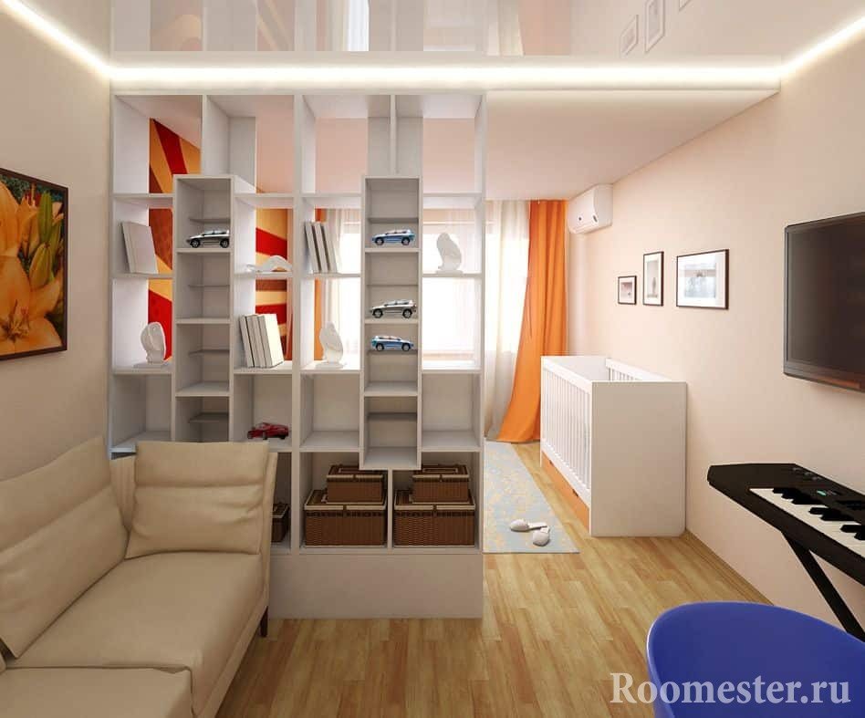 Antes de proceder a la zonificación de una habitación en una sala de estar y una guardería, es necesario considerar expandirla para incluir habitaciones contiguas: un balcón, despensa, etc. El uso de "reservas ocultas" puede tener un efecto al crear zonas para niños y adultos en una habitación.