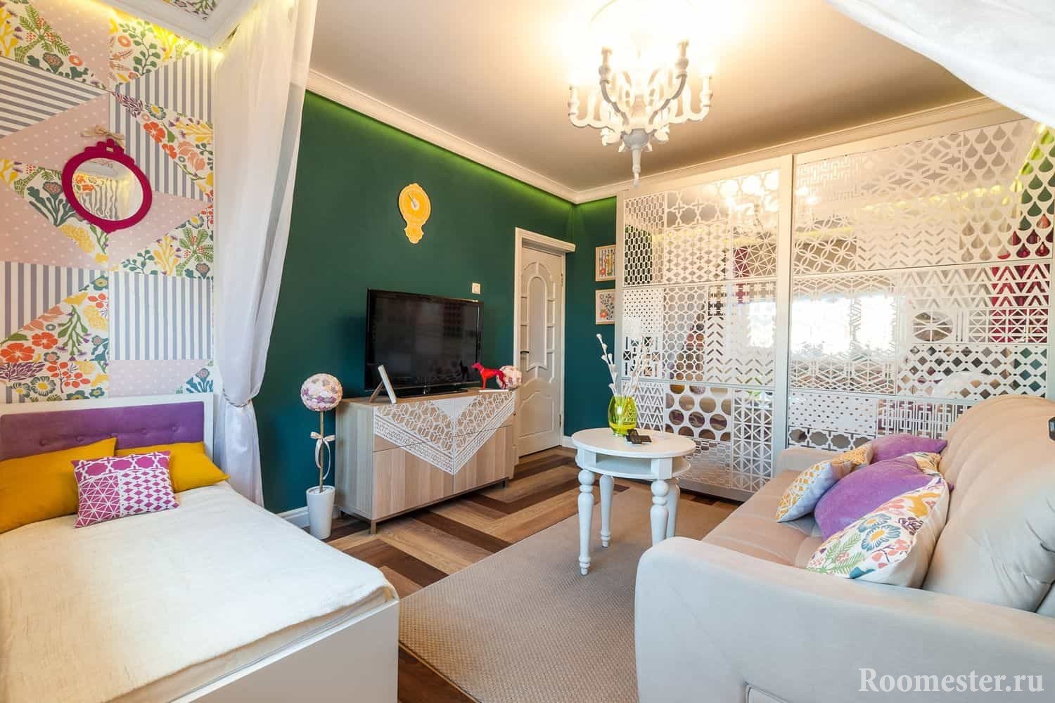 Para crear la ilusión de dos habitaciones en una, puede usar estructuras decorativas en el techo y las paredes. Más a menudo, las construcciones de paneles de yeso se utilizan para estos fines. La opción más elemental es una abertura arqueada. Pero debe hacerse con un radio máximo y un mínimo de espacio "robado". Después de todo, la tarea de tal arco es separar simbólicamente las dos zonas. La complejidad de la construcción de paneles de yeso está limitada solo por la imaginación del autor. Por lo tanto, el arco no es la única opción de zonificación. Desde allí puede, por ejemplo, hacer una estantería decorativa. Además, una viga de madera se puede utilizar como elemento de techo en el interior. No solo dividirá visualmente el espacio en zonas, sino que también se convertirá en la base para la barra de la cortina o la cortina de pantalla que separa el cuarto de niños y la sala de estar.