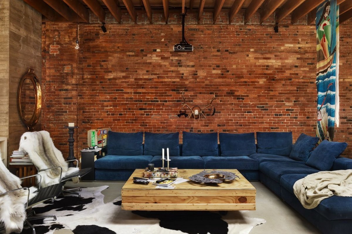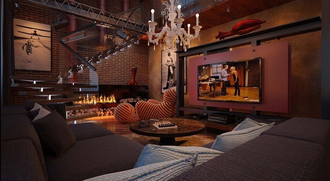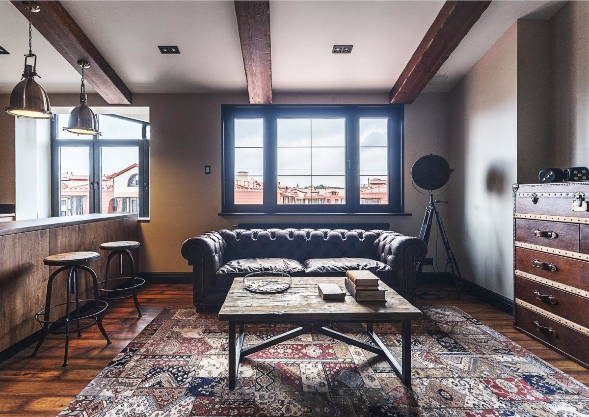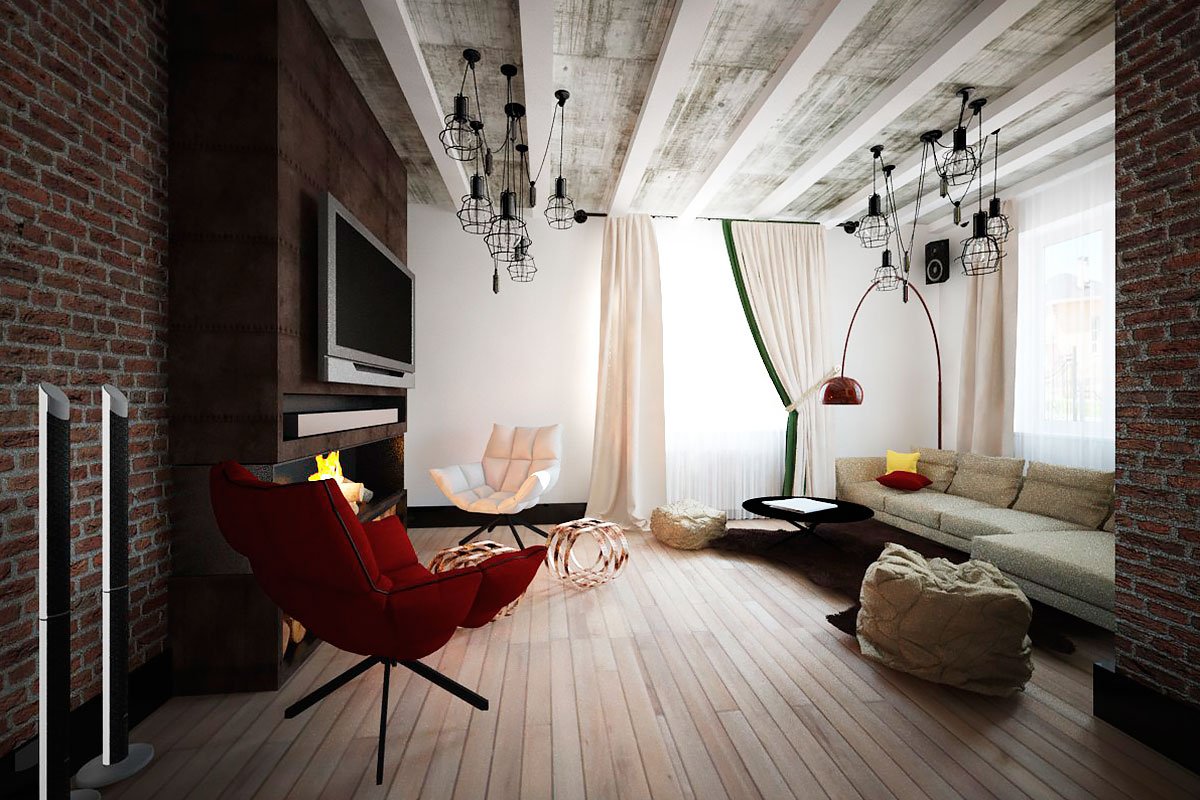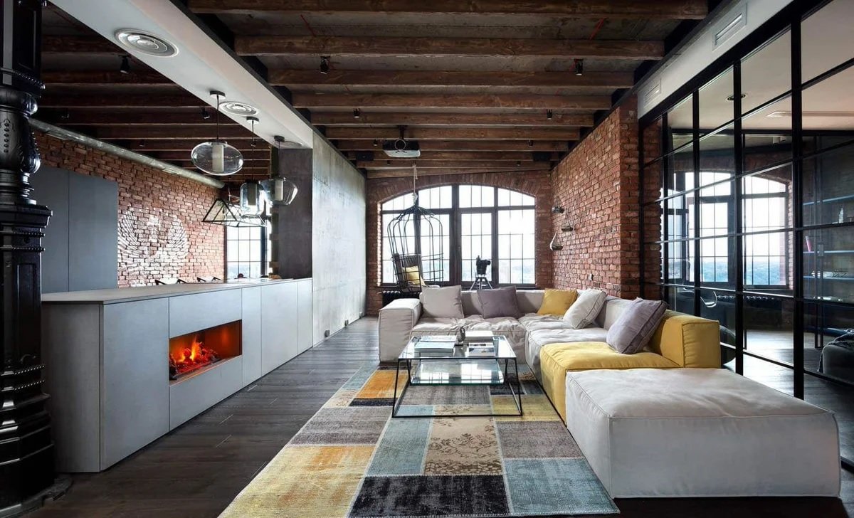 Cualquier elemento de la sala de estar debe presentarse en su forma original. Cualquier decoración debe estar oculta tanto como sea posible. Un rasgo característico de las salas de estar son las vigas y las comunicaciones que se ejecutan justo debajo del techo. Anteriormente, estas eran partes naturales del interior, que son una parte integral de los talleres y las instalaciones de la fábrica. Ahora se usan como decoración.