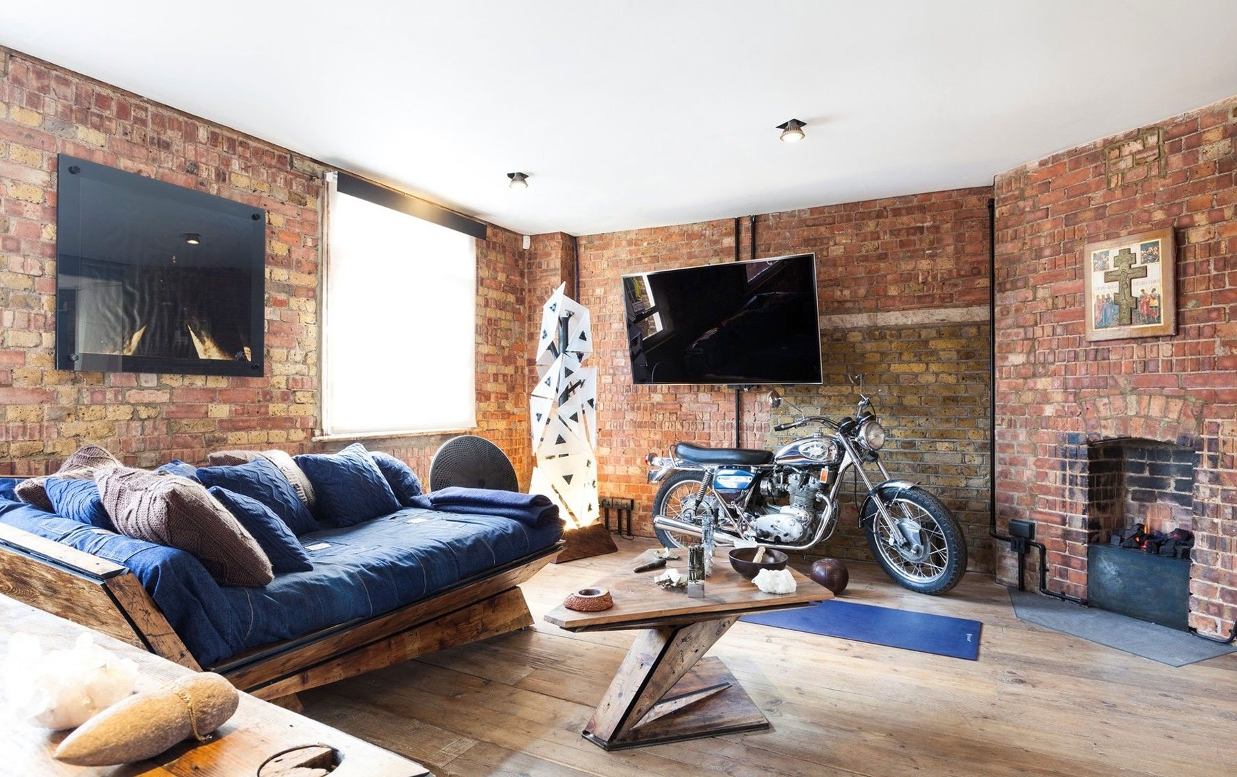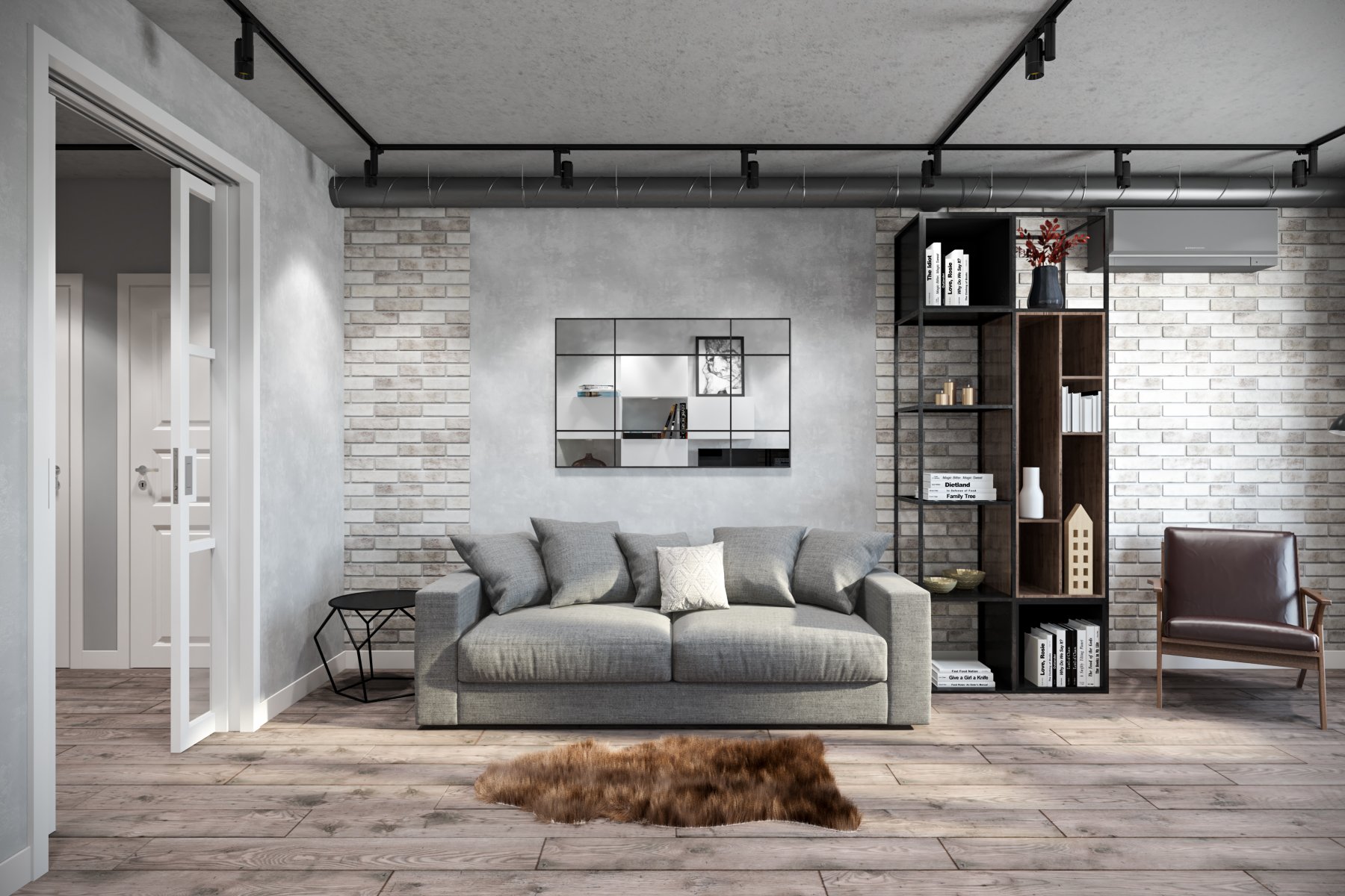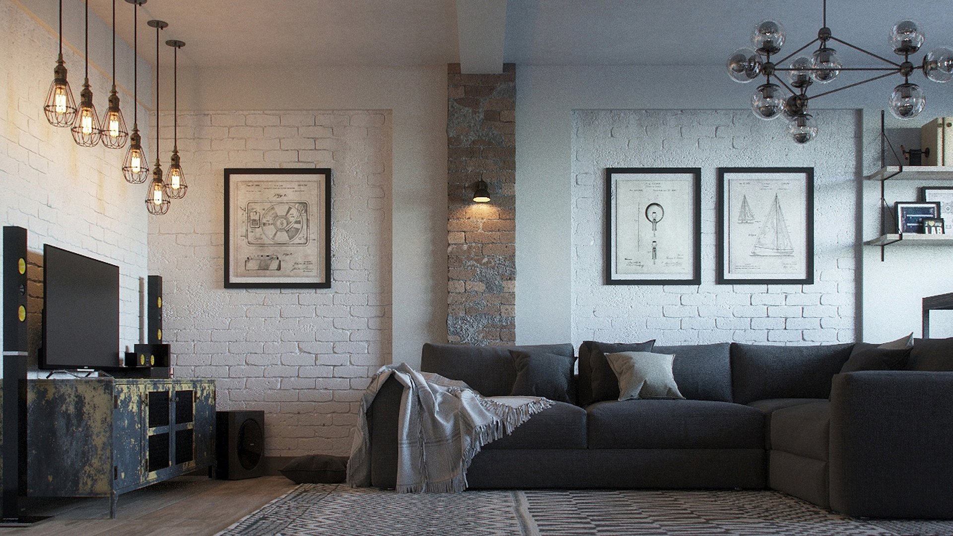 Cualquier elemento de la sala de estar debe presentarse en su forma original. Cualquier decoración debe estar oculta tanto como sea posible. Un rasgo característico de las salas de estar son las vigas y las comunicaciones que se ejecutan justo debajo del techo. Anteriormente, estas eran partes naturales del interior, que son una parte integral de los talleres y las instalaciones de la fábrica. Ahora se usan como decoración.