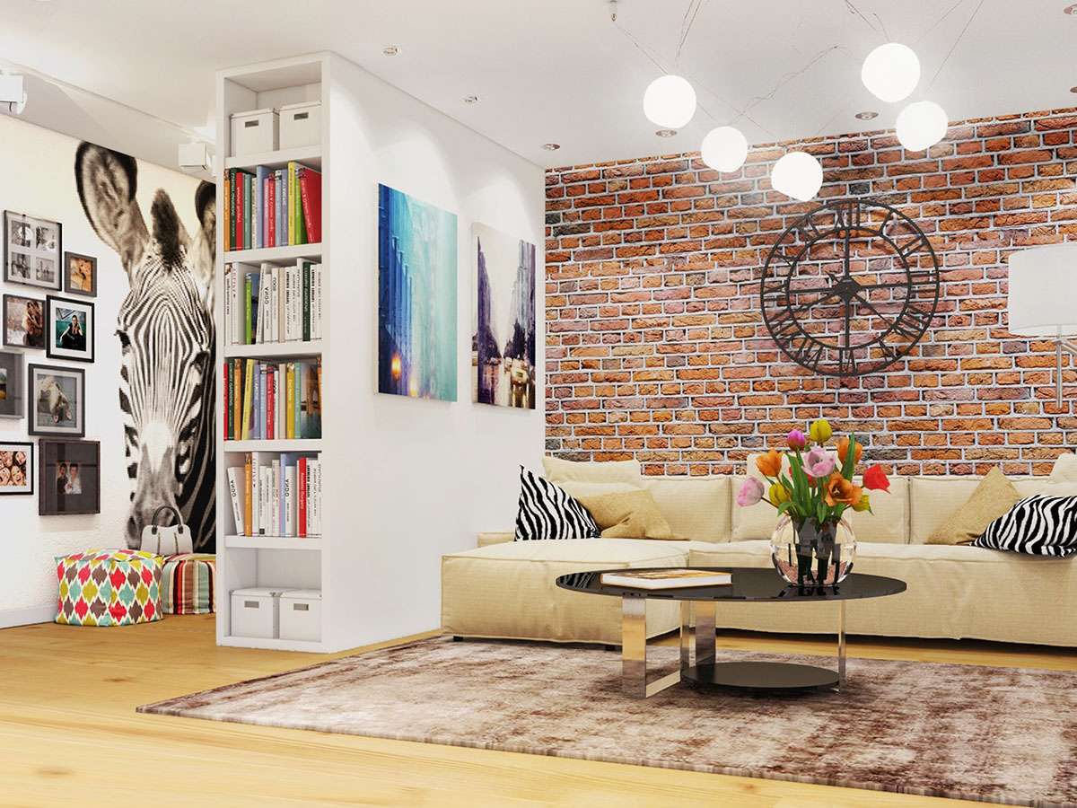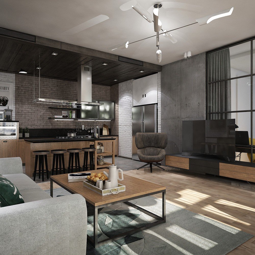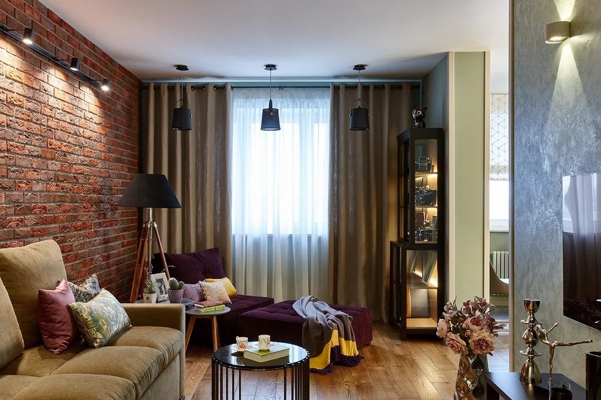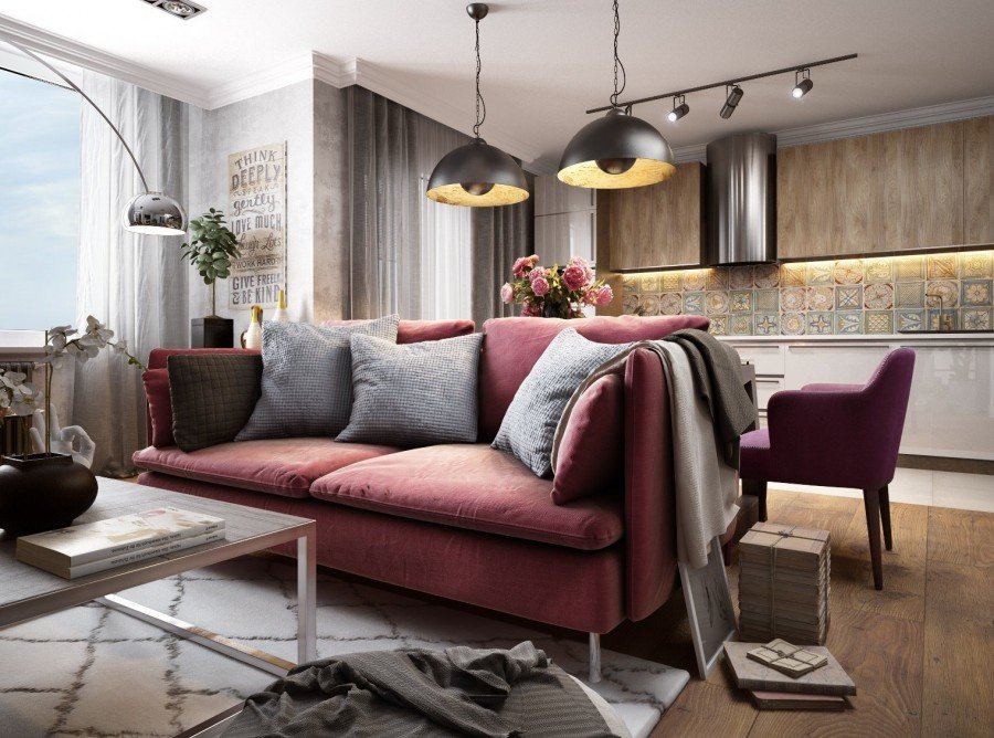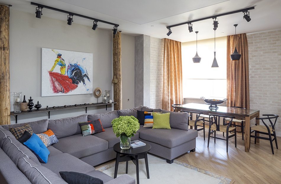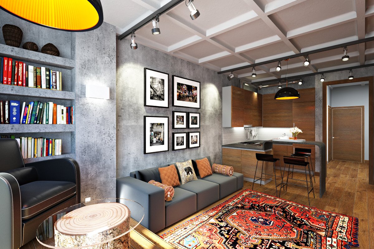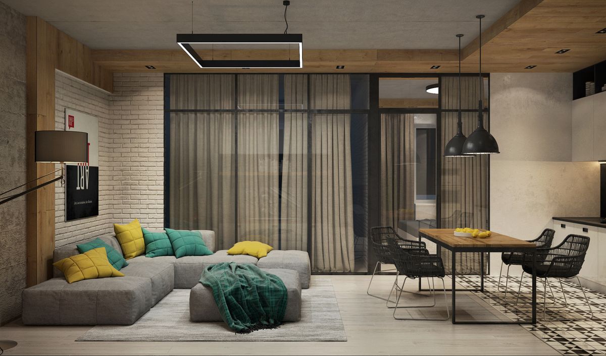 Los tonos fríos, las designaciones individuales brillantes crearán el ambiente adecuado y enfatizarán el estilo industrial. El gris es el color estándar para las salas de estar tipo loft. Se usa en todas partes. El interior puede estar presente en cualquier tono. No hay requisitos estrictos en este caso. Un diseñador experimentado puede diseñar una sala de estar moderna en Jruschov en tonos sobrios y realizar la idea de color más creativa.