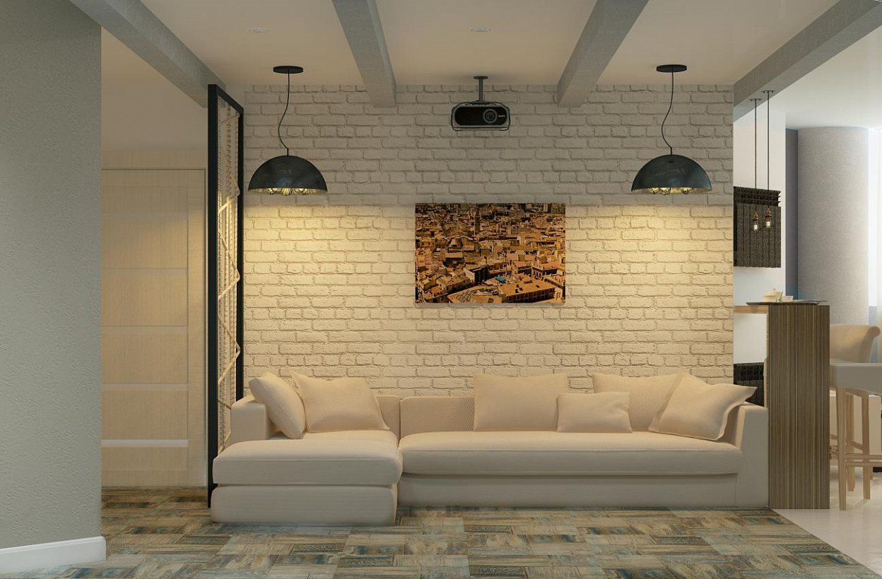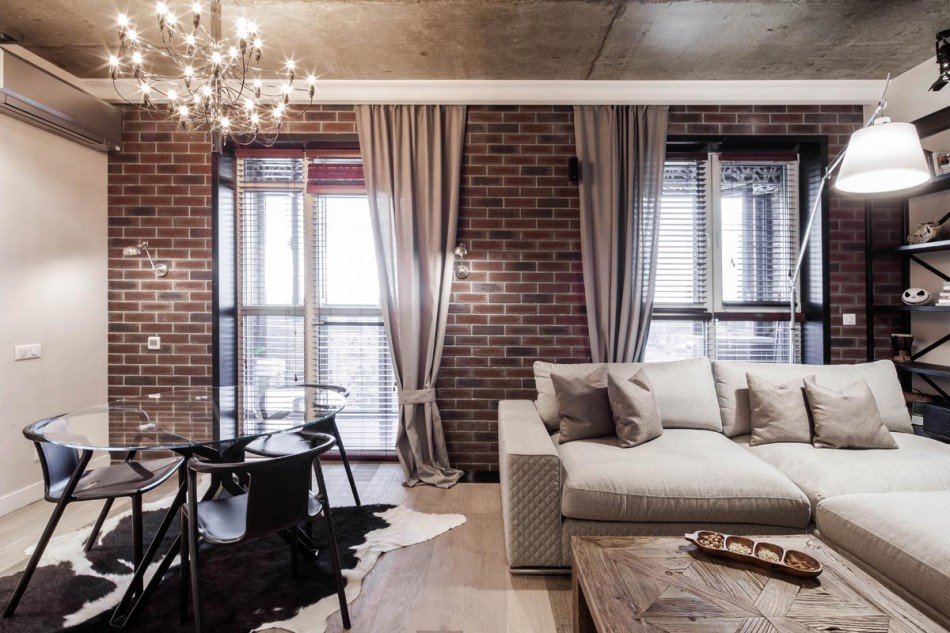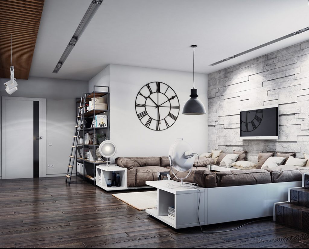 Lo primero con lo que se asocia el estilo loft es con paredes de mampostería. El acabado de las superficies horizontales debe ser simple con una decoración mínima. El concreto natural se verá bien. También puede ser barnizado o gris, blanco, pintura beige. La moldura del techo y un zócalo clásico complementarán la imagen general.