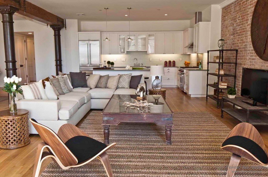 La elección tradicional de los amantes del loft interior original. El color blanco le da un valor adicional. En una sala de este tipo es agradable pasar tiempo, las paredes claras se relajan y pacifican. El color blanco está en perfecta armonía con cualquier otro, enfatizando los detalles necesarios.Se pueden distinguir las siguientes características clave de las salas blancas:
