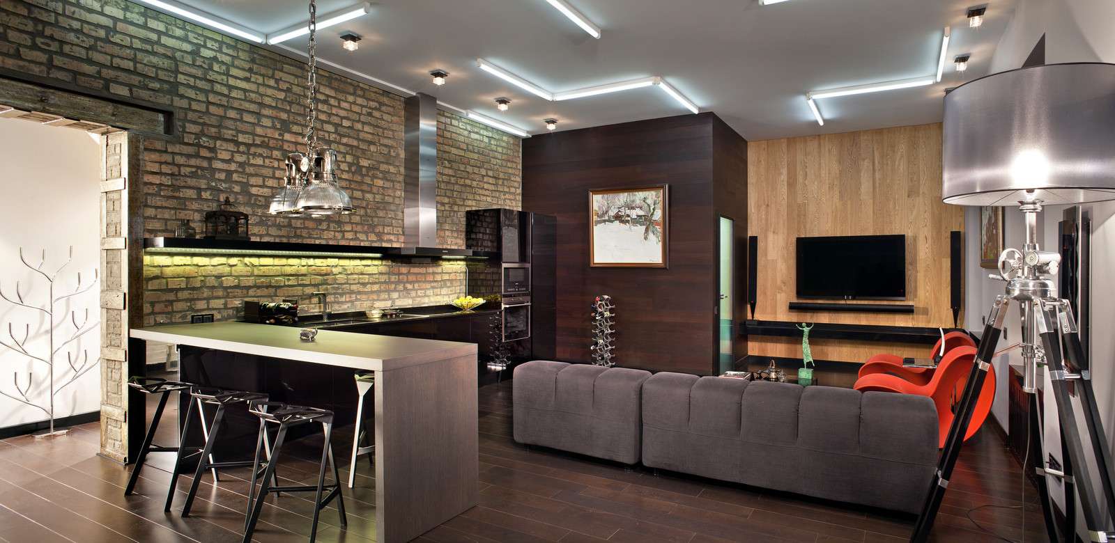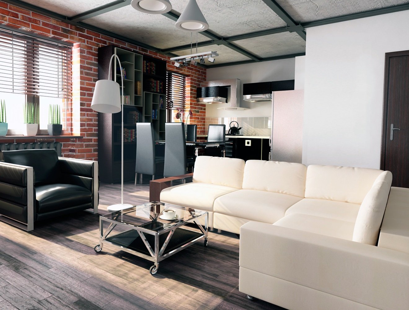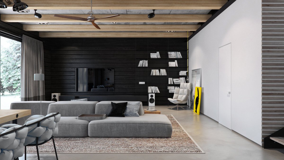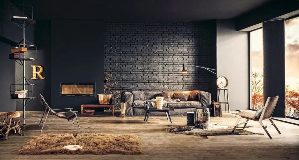El color de estas salas de estar es pobre. Solo se permite un interior simple e inacabado. Los mejores materiales para el techo son hormigón en bruto, ladrillo, metal, madera. Decorarlo con vigas de poliuretano. Las piezas de comunicación están pintadas de negro o de acero inoxidable.