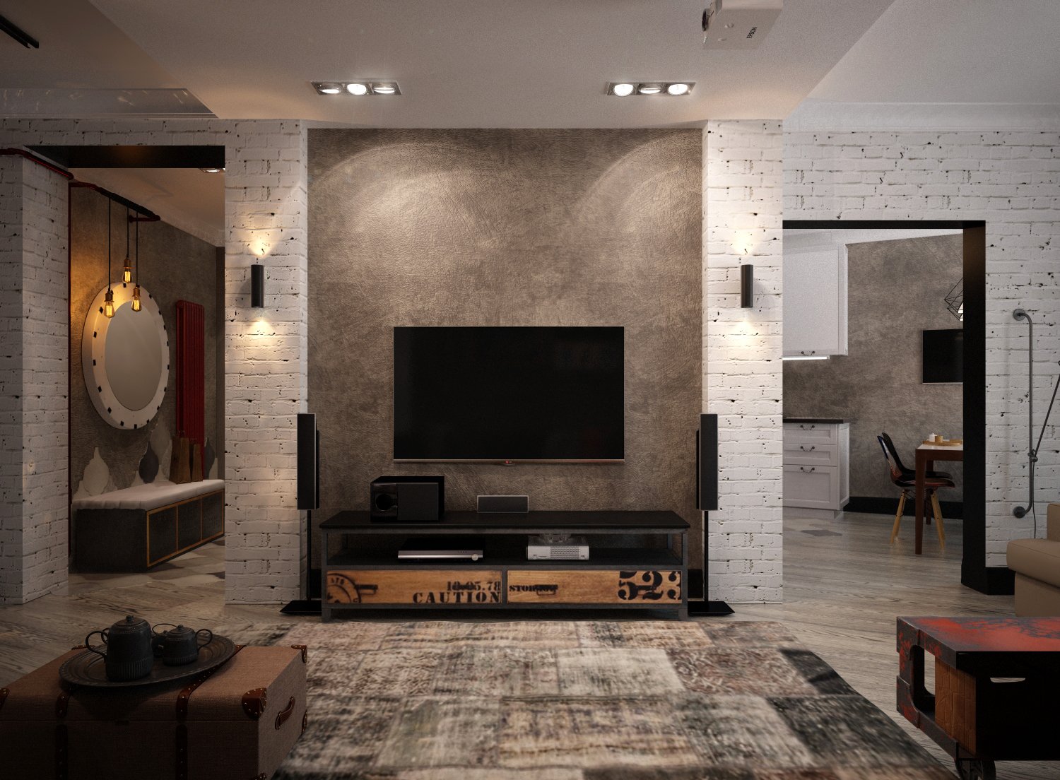 Al elegir una alfombra tipo loft, primero debe indicar su propósito.Esto puede ser un revestimiento de piso discreto, cuya tarea es solo enfatizar ligeramente la pertenencia de la sala de estar a la era industrial, o el centro de la composición, que tiene un cierto significado. Los factores decisivos son el color y la textura. Los productos excéntricos envejecidos artificialmente son especialmente populares.