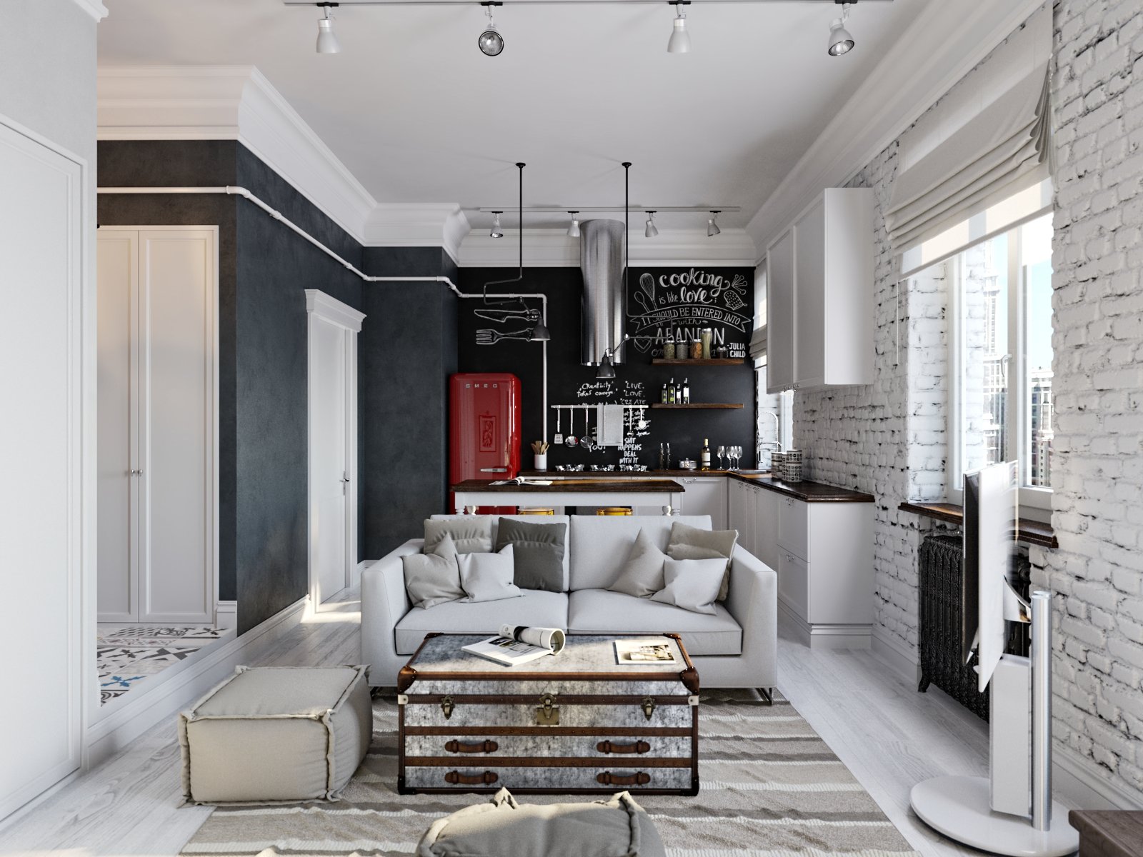 Los muebles con ruedas son algo normal en el estilo loft. Esto facilita mover sofás pesados, sillas, sillones y armarios. Lo más destacado de la tendencia de la moda industrial es la apertura de todos los elementos. Para almacenar varias cosas use cofres, cajas de cartón, armarios sin puertas.