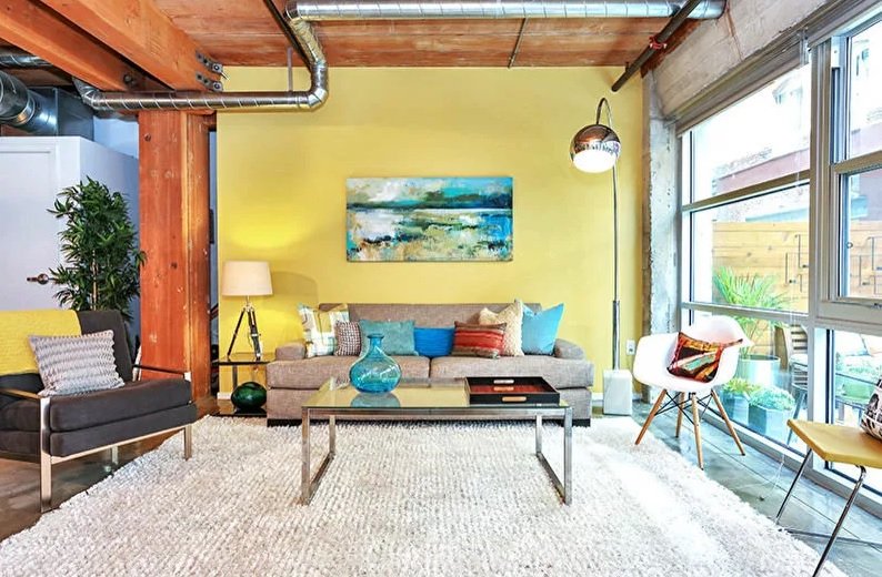 En el momento del origen del estilo original, era difícil imaginar las premisas en amarillo.Los diseñadores modernos consideran que las luminosas salas de estar tipo loft son una decisión interesante y audaz. A los fanáticos de la creatividad les encantarán los muebles extravagantes, los textiles gritando, complementados con un limonero vivo en el medio de la habitación.