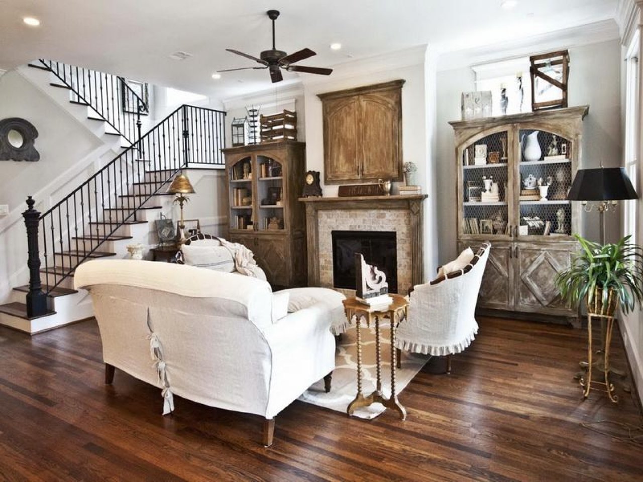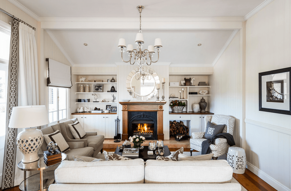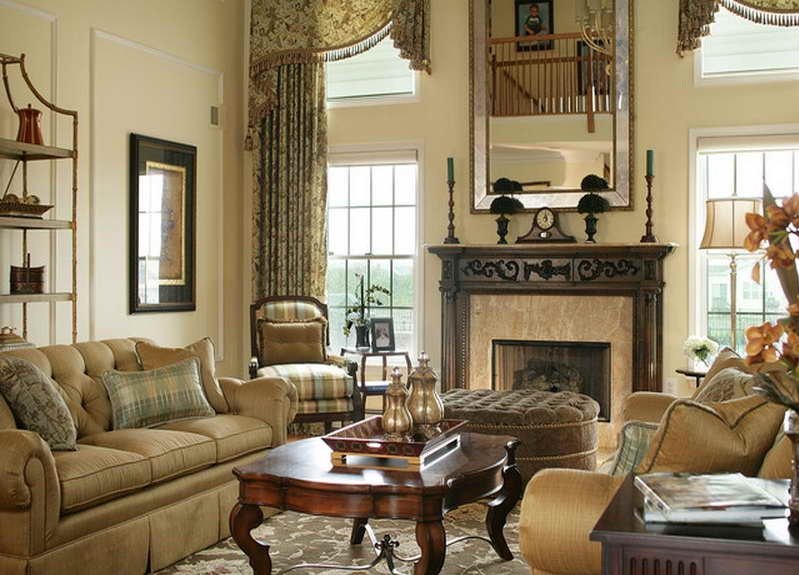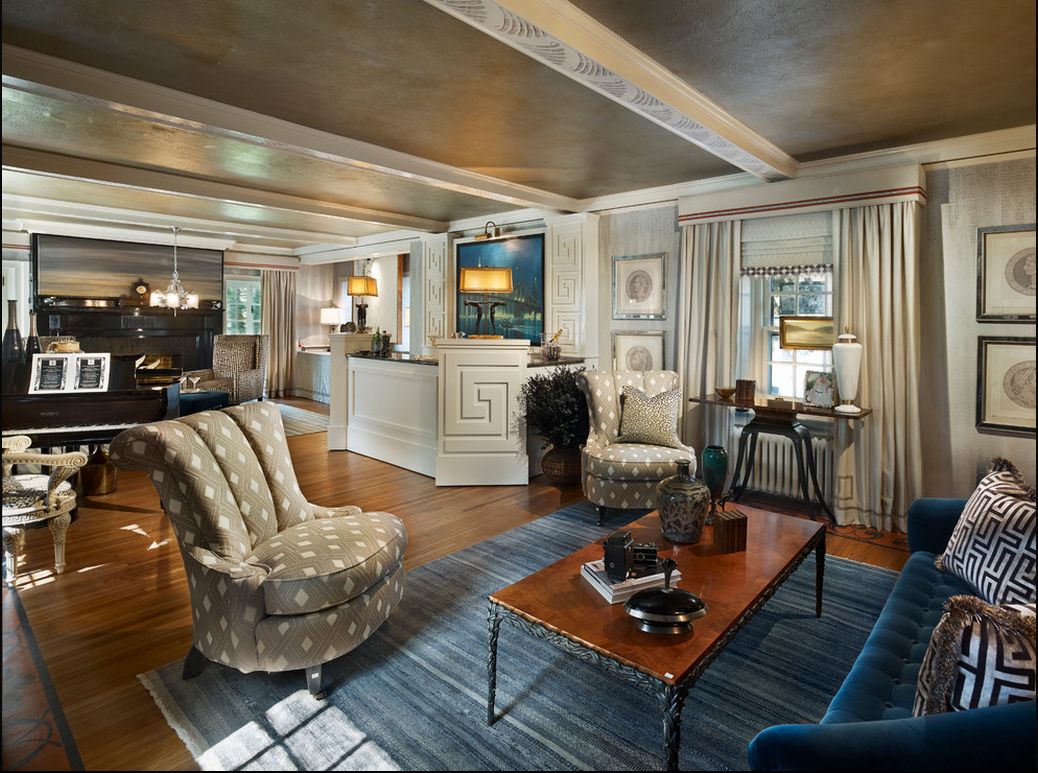 La sala de estar de una casa de campo a menudo se calienta con una chimenea real o está decorada con una falsificación. La sala de la sala generalmente no es grande ni pequeña, aproximadamente promedio.A menudo se practica el plan abierto: la sala se combina con la cocina, el dormitorio, el baño y el inodoro detrás de la pared. Las particiones aquí solo existen en forma de pantallas caladas con diseños elegantes, pantallas textiles pintadas. La zonificación también se lleva a cabo utilizando varios colores del piso, las paredes y las diferencias en las alturas del techo. Las paredes se seleccionan principalmente gris, azul pálido, beige: esto generalmente se hace en tres paredes, la cuarta se vuelve brillante, acentuada. El piso es ligeramente más oscuro que las paredes, el techo es mucho más claro.