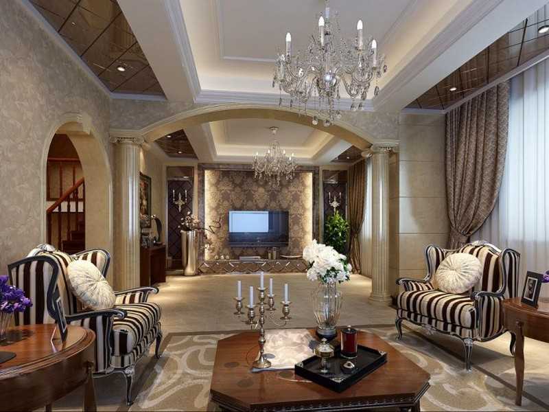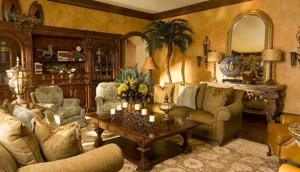 Los papeles pintados de seda caros y de alta calidad con adornos florales complejos que adornan las paredes de la sala de estar crean una atmósfera de calidez y comodidad. El papel tapiz preferido es el dorado-perla, gris-beige, verde-marrón. Para cumplir con el diseño estilístico, no se deben combinar varias opciones de acabado en una pared. También se aceptan yesos decorativos, de color, papel tapiz líquido, pinturas. Es deseable que las paredes sean lo más lisas posible. Si la sala de estar se combina con la cocina, la cocina se presenta con mosaicos finos, y la zona mencionada se destaca lo más suavemente posible.