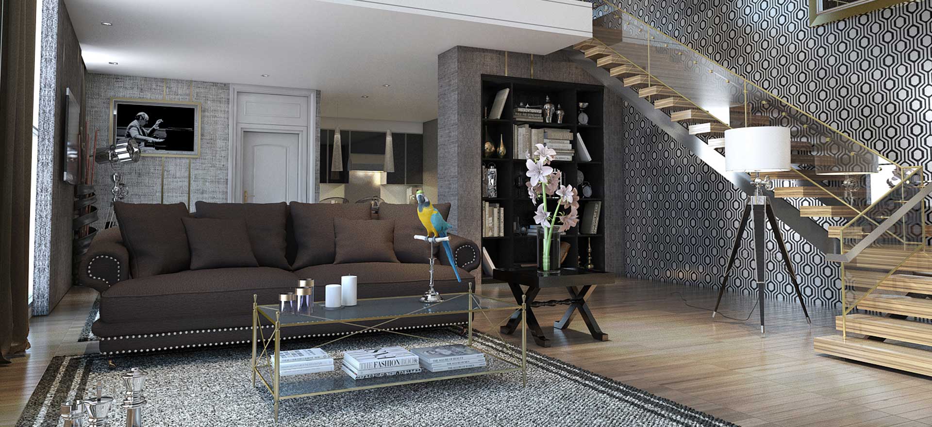 Los métodos de diseño deben parecerse a una variedad de motivos naturales. A menudo hay puertas hechas de madera natural, en su mayoría oscuras, y en apartamentos de dos pisos: escaleras de caracol de mármol hasta el segundo piso.