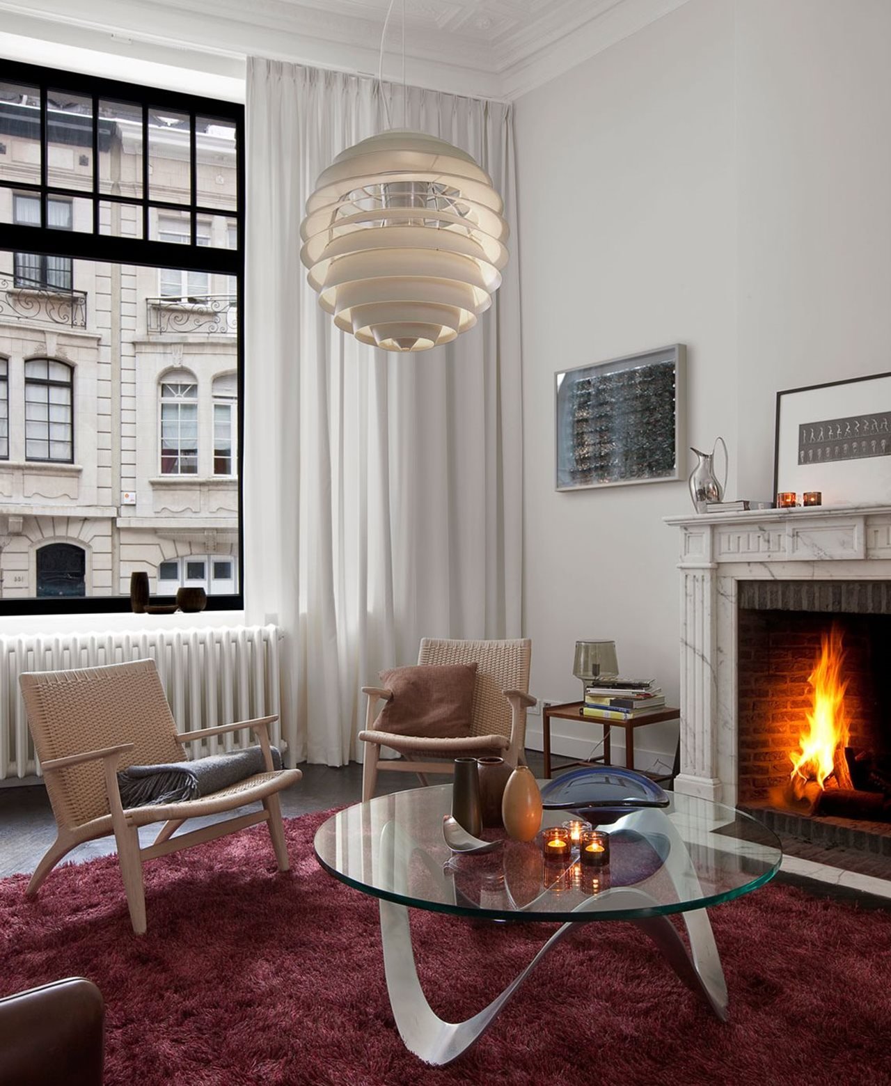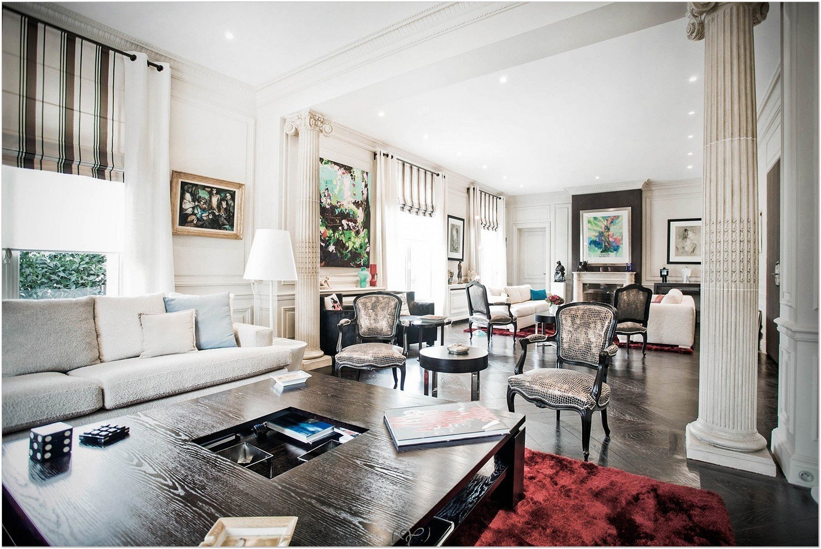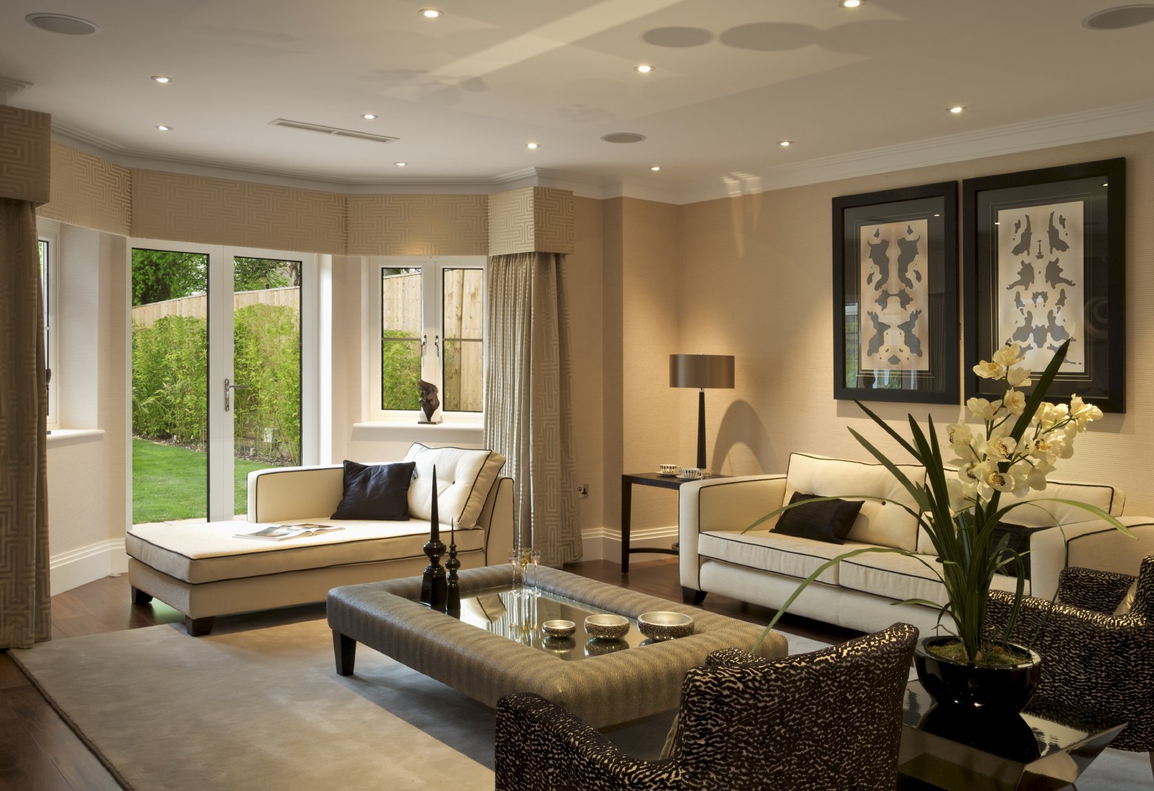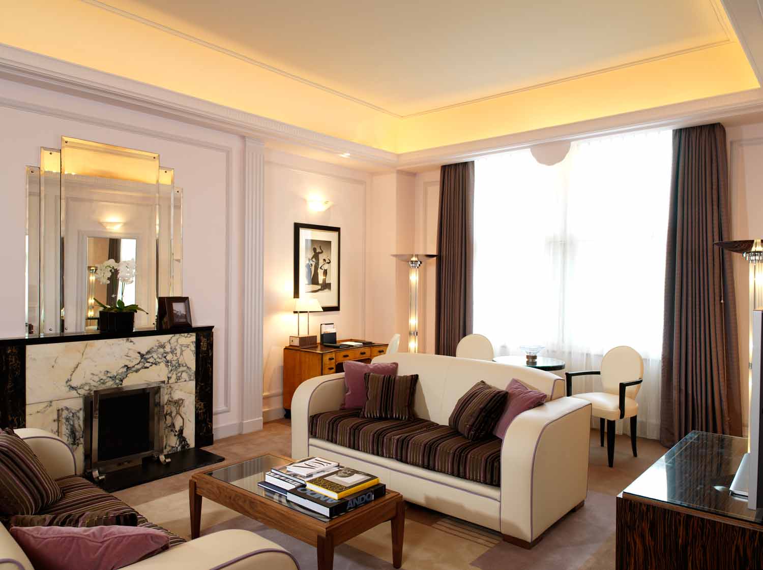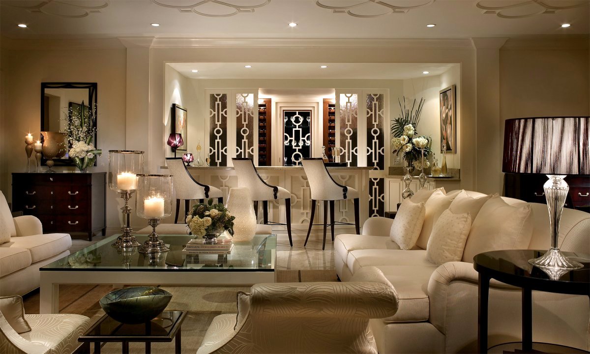La luz brillante aquí es básicamente inaceptable: las habitaciones están iluminadas por lámparas de pie, apliques y focos. La luz natural es muy apreciada: la luz debe penetrar libremente a través de grandes ventanas. La iluminación alrededor del perímetro del techo se combina originalmente con una o dos lámparas de techo de múltiples vías, lámparas de pared, de mesa sobre el lugar de trabajo, lámparas de pie al lado del sofá. Algunos elementos de decoración también a veces se destacan: espejos, pinturas, esculturas. Los nichos decorativos hechos de paneles de yeso, jarrones o figuras en ellos también están iluminados con focos. En casos raros, iluminación LED del piso, muebles individuales.