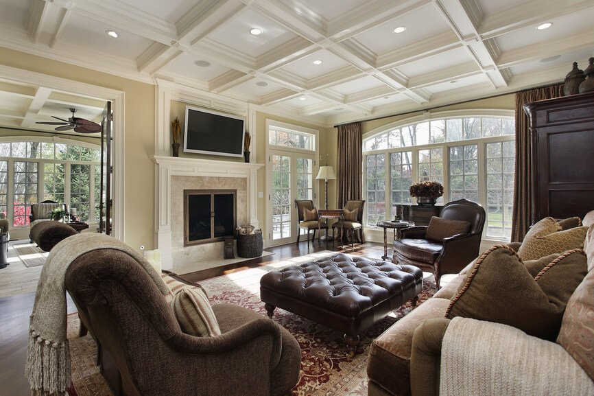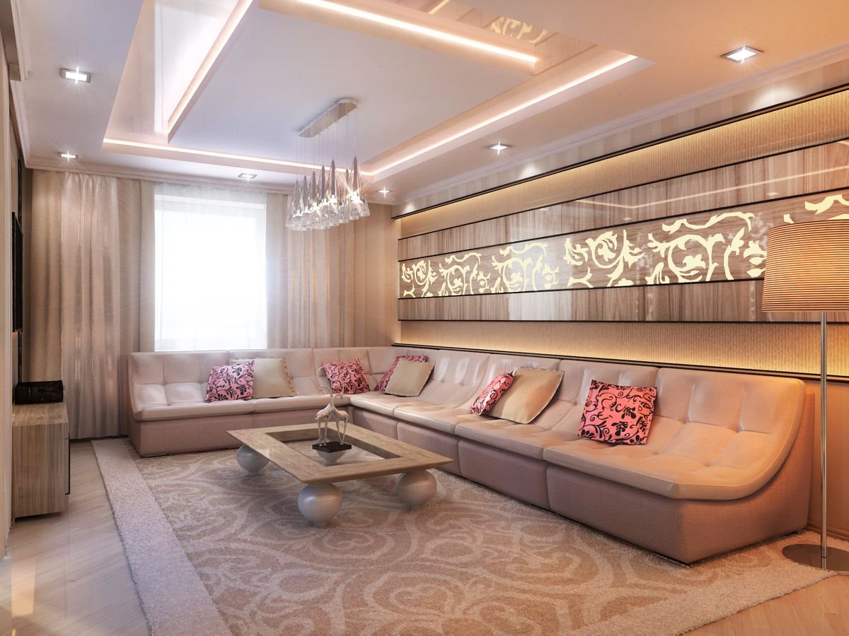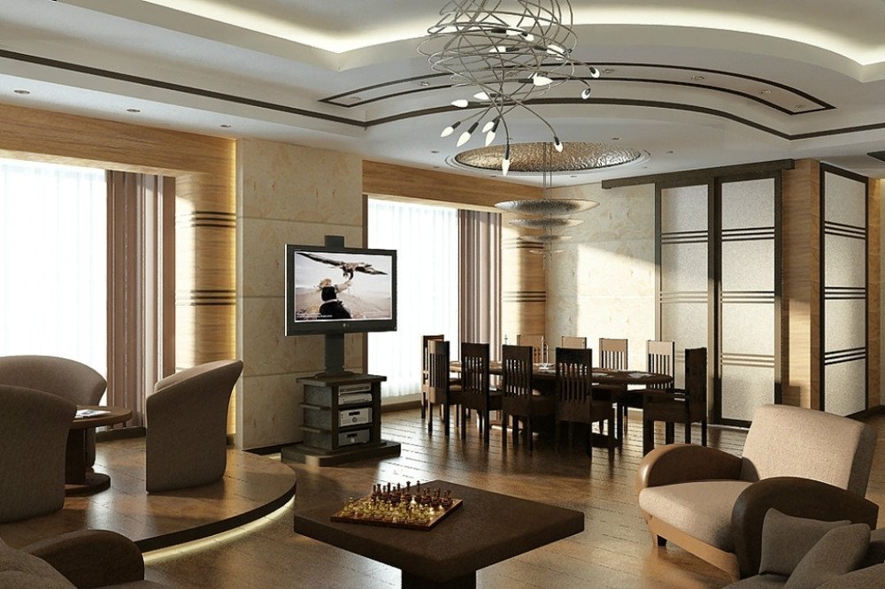 La zonificación de un apartamento tipo estudio, una sala espaciosa y ordinaria a menudo se realiza utilizando diferentes alturas, colores del techo: el centro de la sala de estar se ejecuta en un área más liviana que el dormitorio y la cocina. El techo también a veces está decorado con madera, principalmente madera clara.En casos raros, varias columnas lo sostienen, en una textura adecuada para el diseño general de la sala, a veces hay elementos de estuco.