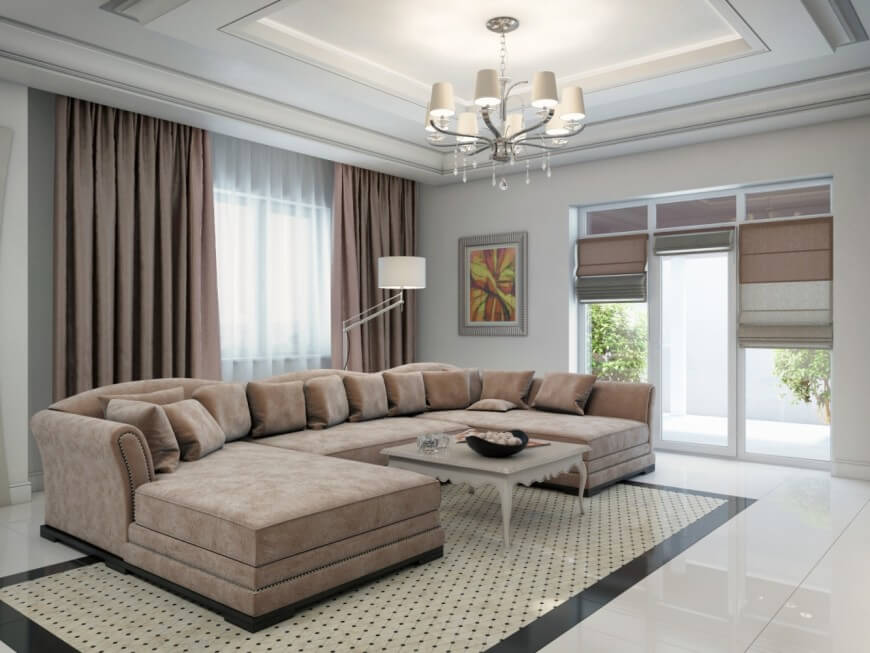 En el sofá, se aceptan almohadas brillantes multicolores de varias formas, tamaños, preferiblemente colores lisos. La manta de piel se calentará en las noches frías de invierno, se selecciona oscuro o contraste. La tapicería textil de los muebles tapizados está hecha con tela de muebles costosos, a veces cuero, cuero ecológico.