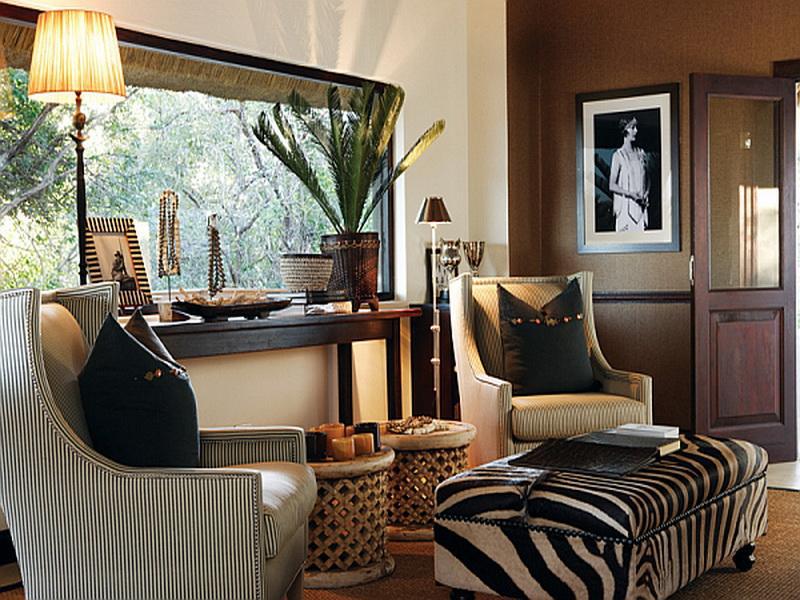 Las paredes están decoradas con placas decorativas, cuadros enmarcados, espejos extraños o simples marcos rectangulares en negro y marrón. Todos los accesorios se seleccionan grandes, brillantes, formas artísticas, texturas. Los elementos de piedra, bronce, plata, dorado, con elementos de forja son bienvenidos. Las pinturas de vidrieras, las pantallas de lámparas de pie, la decoración parcial del techo con vidrieras agregan un toque especial a la habitación. Las plantas verdes vivas en macetas de cerámica están bellamente dispuestas en las ventanas, sostenedores forjados o de madera para macetas, y las macetas decorativas también están unidas a las paredes. Figuras de peces, silbatos de arcilla, enormes conchas marinas, ataúdes de madera tallada, figuras de marfil africano, pequeñas imágenes o fotos familiares en marcos oscuros con elementos de una "pátina noble" se colocan al azar en estantes.