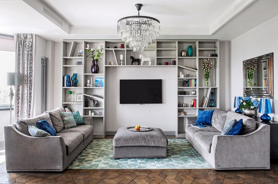 Las paredes del salón moderno sirven como telón de fondo para muebles, decoración, porque no gastan mucho dinero en su diseño.