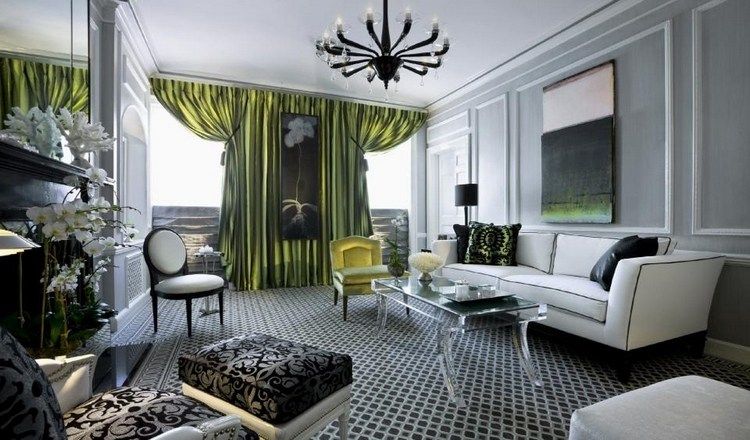Los colores principales de este interior son gris, blanco, beige. Los tonos de contraste separados aquí serán verde, negro, chocolate, rosa, amarillo-naranja, rojo-escarlata. Combinaciones más populares: