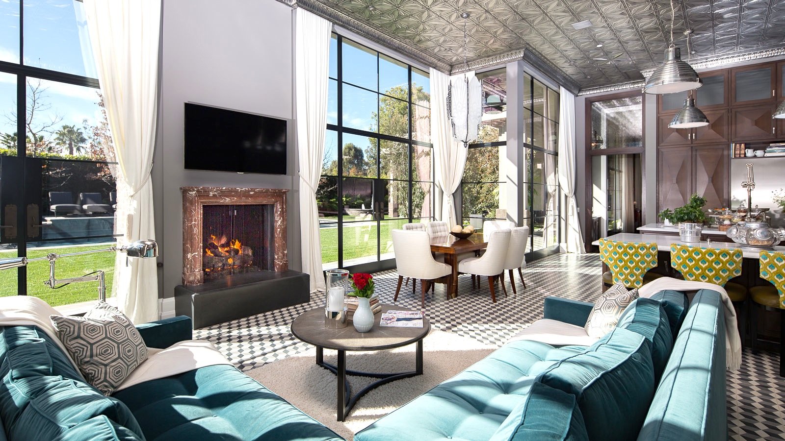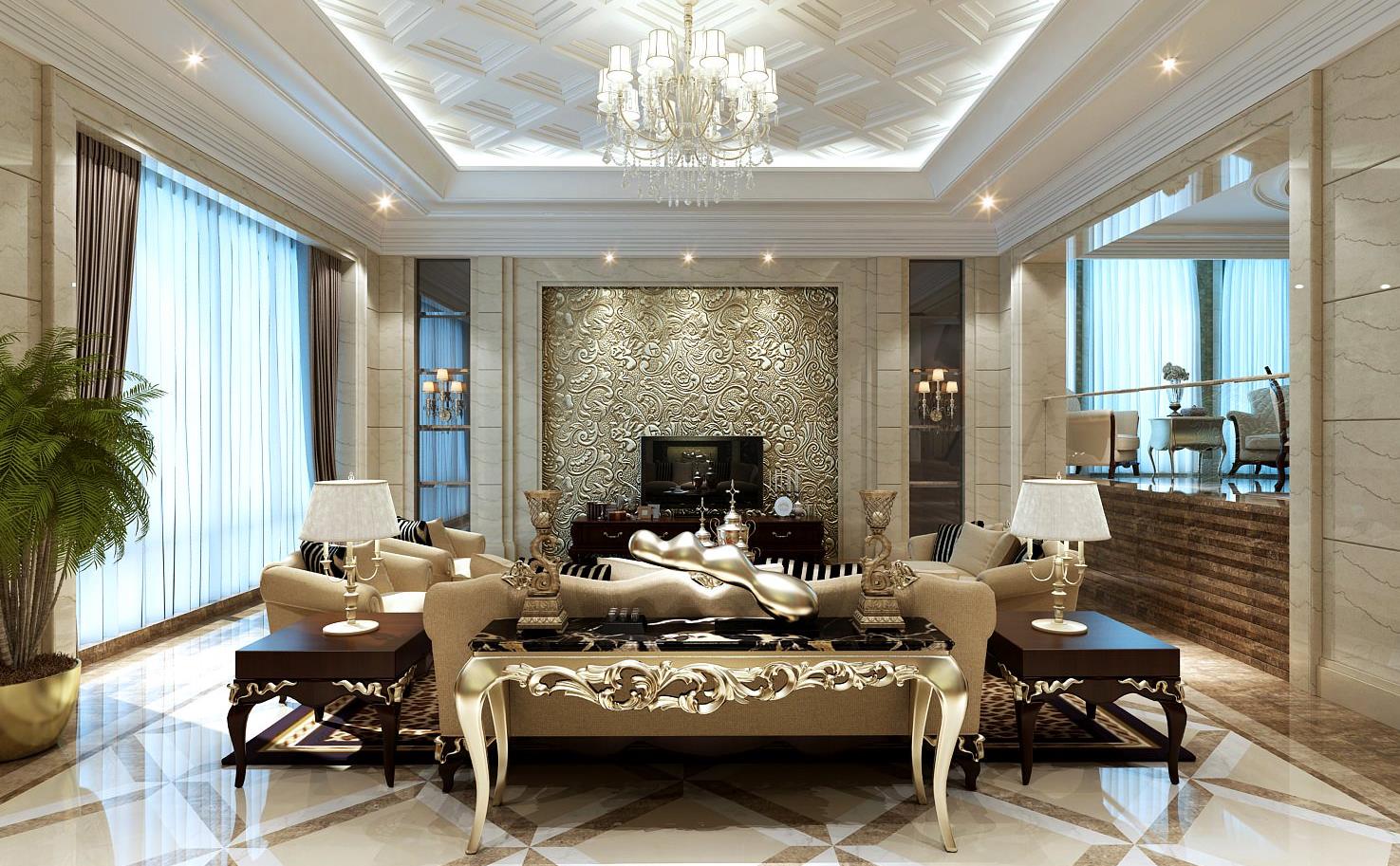 Los techos generalmente tienen varios niveles, patrones asimétricos. Se llevan a cabo por tensión, suspendidas, con múltiples fuentes de luz. Sus colores son principalmente claros, pero se permiten espejos y mosaicos coloridos con adornos florales. A veces se usan tejas de textura compleja. La zonificación de un apartamento tipo estudio, una sala espaciosa y ordinaria a menudo se realiza utilizando diferentes alturas, colores del techo: el centro de la sala de estar se ejecuta en un área más liviana que el dormitorio y la cocina. El techo también a veces está decorado con madera, principalmente madera clara.En casos raros, varias columnas lo sostienen, en una textura adecuada para el diseño general de la sala, a veces hay elementos de estuco.
