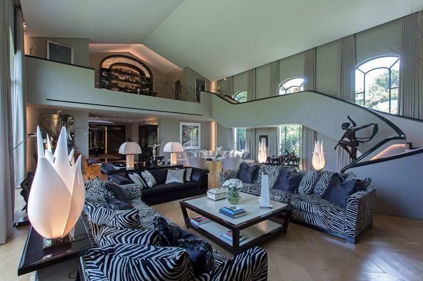 Es preferible que la alfombra sea grande, casi toda la habitación, lisa, oscura, con un montón largo.Combina con éxito elementos individuales de muebles a su alrededor, sin llegar a las paredes de 15-20 centímetros. Una alfombra redonda es adecuada para una sala de estar cuadrada; dos o tres alfombras se colocan en la habitación con la configuración "incorrecta", con la ayuda de la cual se divide en zonas el espacio. En el sofá, se aceptan almohadas brillantes multicolores de varias formas, tamaños, preferiblemente colores lisos. La manta de piel se calentará en las noches frías de invierno, se selecciona oscuro o contraste. La tapicería textil de los muebles tapizados está hecha con tela de muebles costosos, a veces cuero, cuero ecológico.