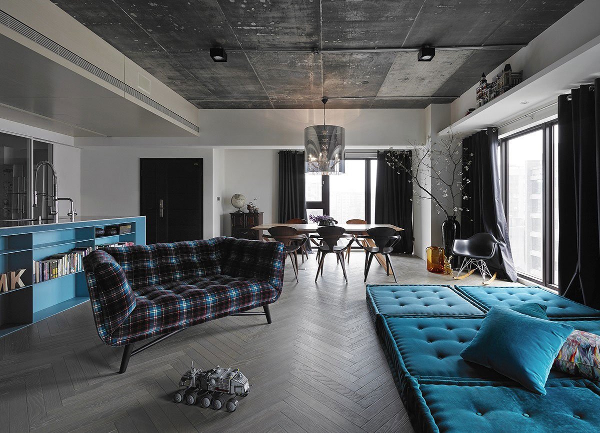 Los muebles no necesitan demasiado, la presencia de un gran espacio libre es un sello distintivo del estilo. La zonificación también se realiza a menudo con muebles, especialmente cuando se trata de un apartamento tipo estudio, cocina y sala de estar.Colgar muebles o tener muchos elementos de hierro forjado es bienvenido.