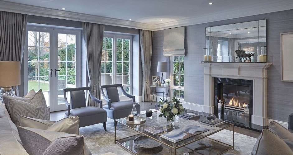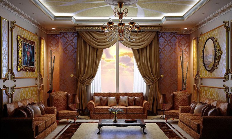 Los papeles pintados de seda caros y de alta calidad con adornos florales complejos que adornan las paredes de la sala de estar crean una atmósfera de calidez y comodidad. El papel tapiz preferido es el dorado-perla, gris-beige, verde-marrón. Para cumplir con el diseño estilístico, no se deben combinar varias opciones de acabado en una pared.