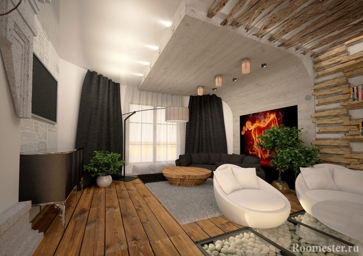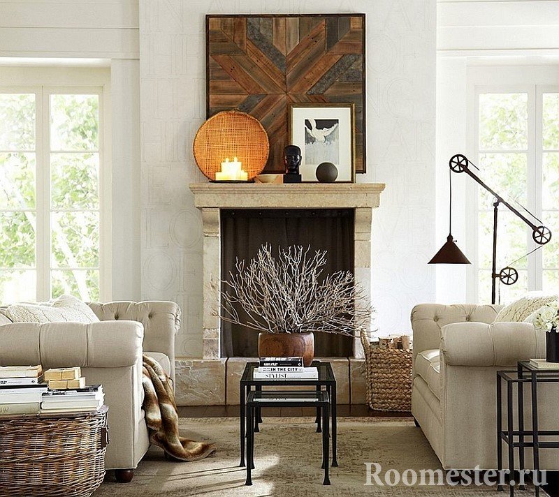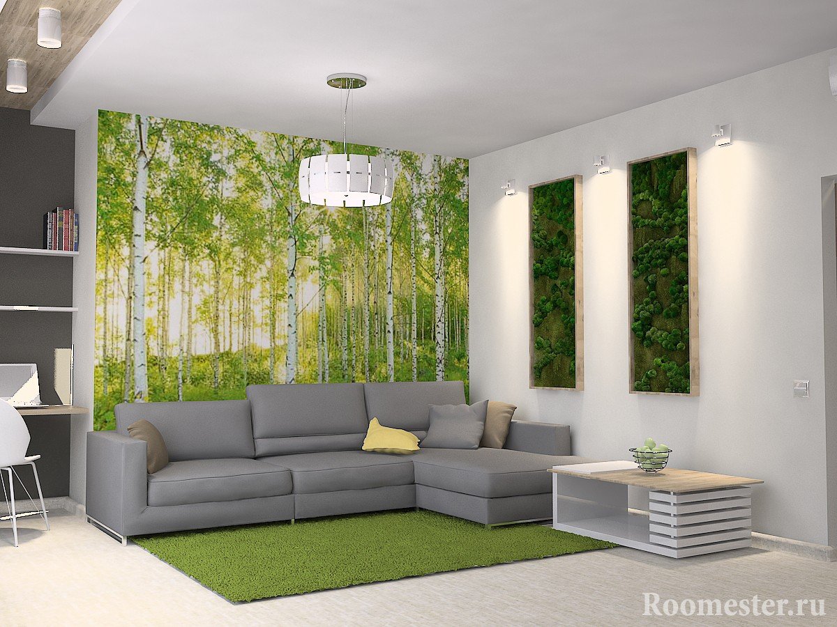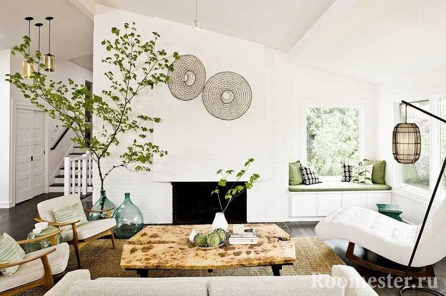 Al decorar, a menudo se usa yeso o papel tapiz tranquilo. Para cubrir el piso, elija madera cálida o cerámica fría. Los textiles de la sala están hechos de materiales naturales. Se alienta el uso de elementos de vida silvestre. Las plantas ornamentales, un acuario con habitantes de las profundidades o una chimenea con combustibles naturales pueden convertirse fácilmente en los centros semánticos del diseño de esta sala de estar.