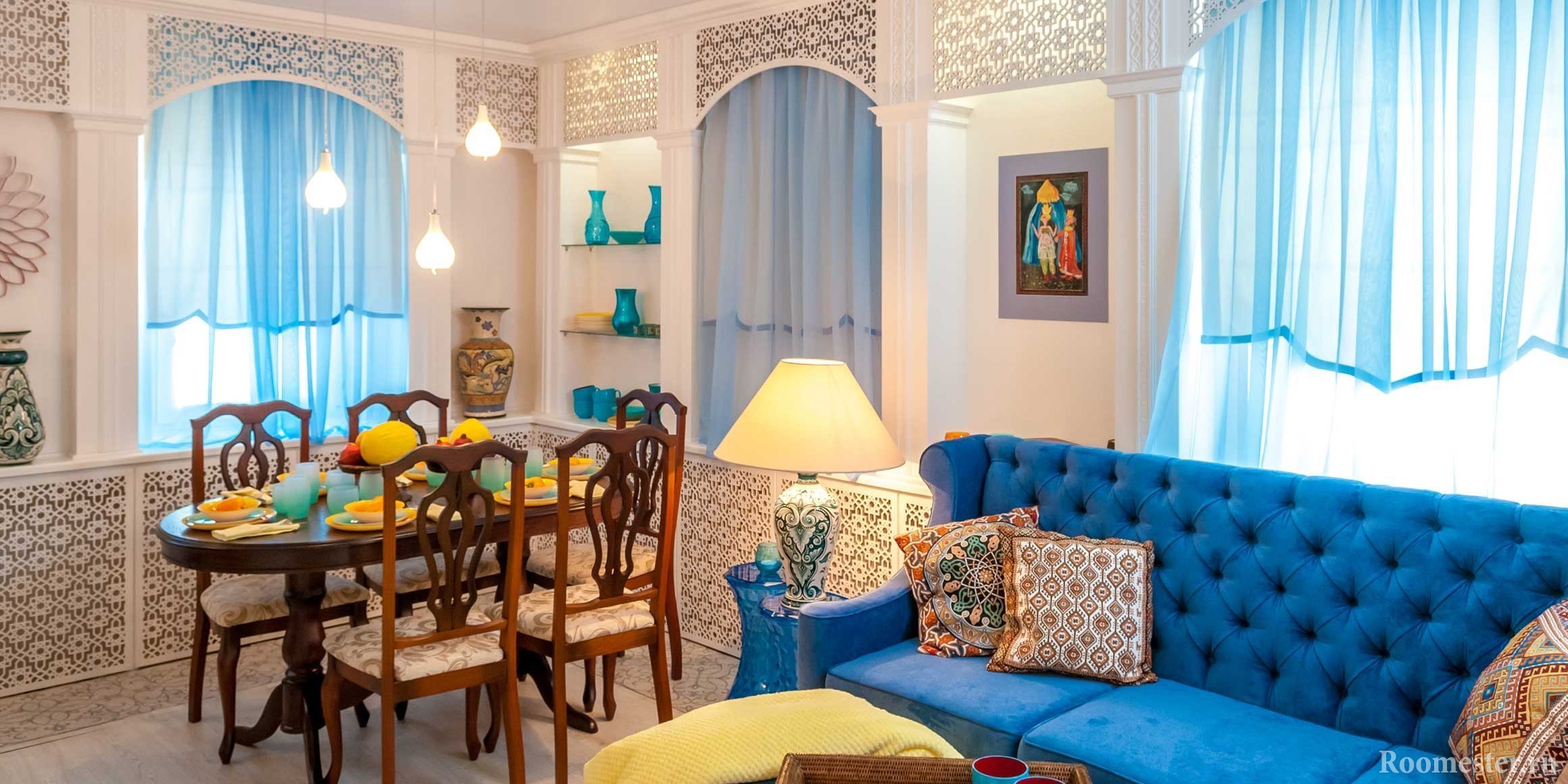 Este grupo de separadores es efectivo para cualquier variación de zonificación. Su uso ayuda a crear fácilmente islotes aislados en la sala de estar. Los elementos de separación aquí pueden ser tanto las estructuras de los muebles como el espacio entre ellos. Por lo tanto, lo más presupuestario es la disposición de los muebles de diferentes zonas "de regreso" entre sí. Por ejemplo, separando el comedor.