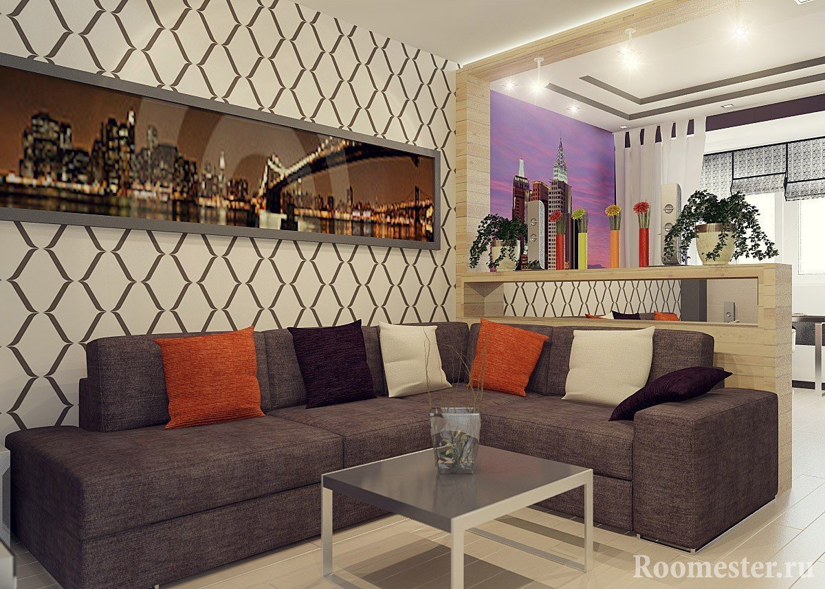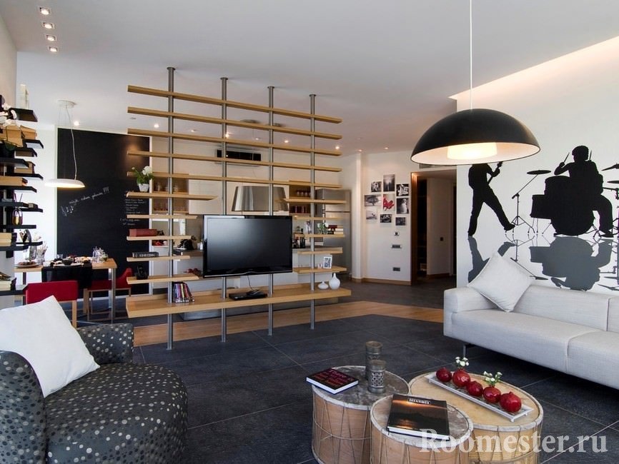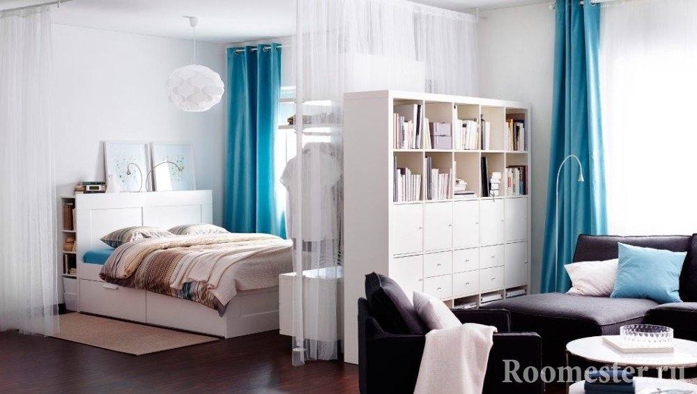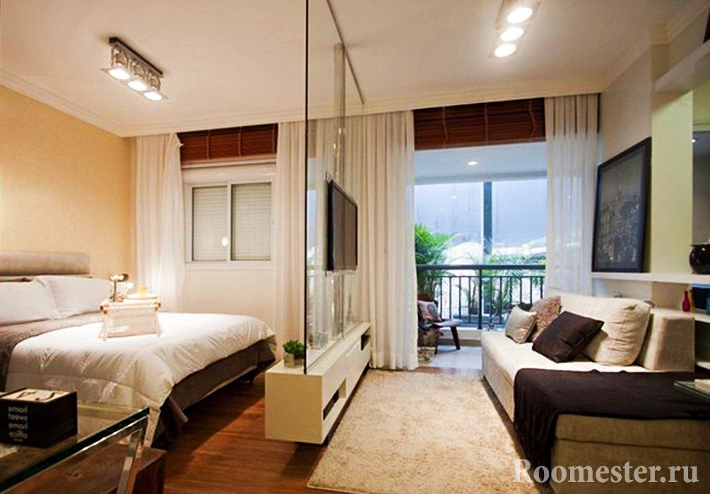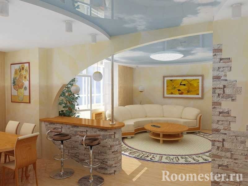 Tal zonificación no impide absolutamente la penetración de la luz solar. Además, permite que el espacio permanezca abierto y ligero. Este método se puede utilizar para resaltar la cocina, el comedor o la cama. Pero en el último caso, solo es bueno en familias con relaciones abiertas y de confianza.