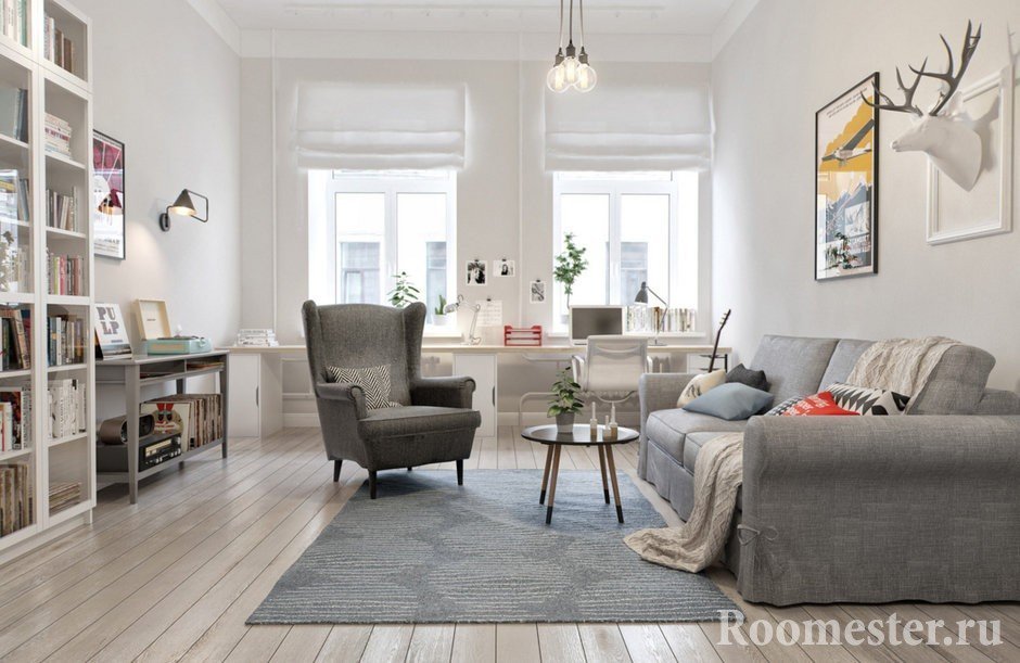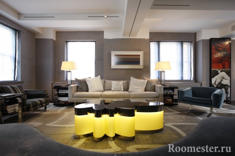 el diseño de la sala de estar se lleva a cabo teniendo en cuenta que la iluminación en el mismo es "medida", especialmente si el área de la sala es grande;