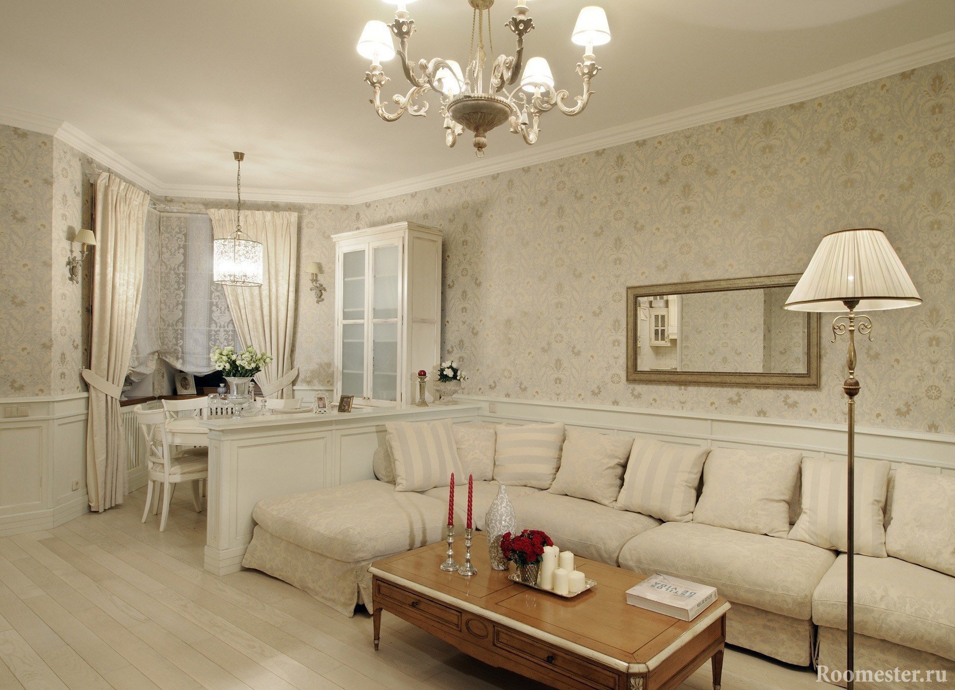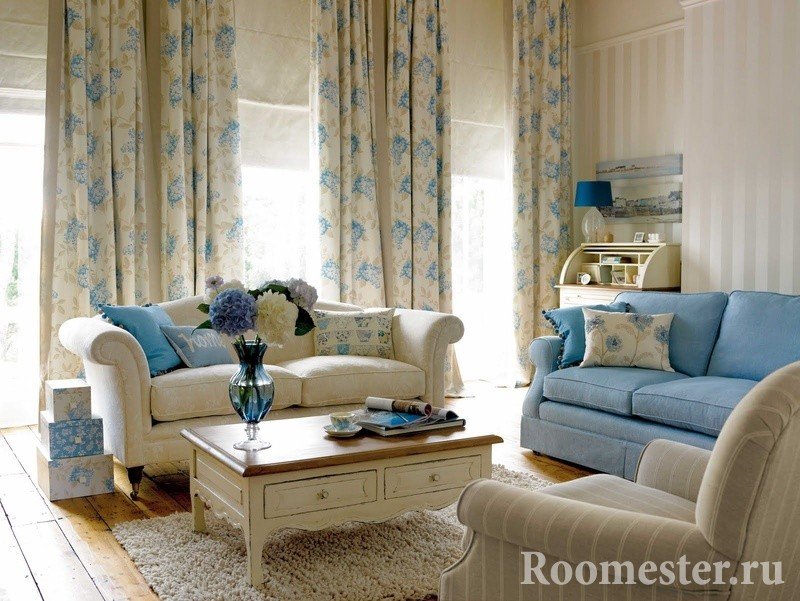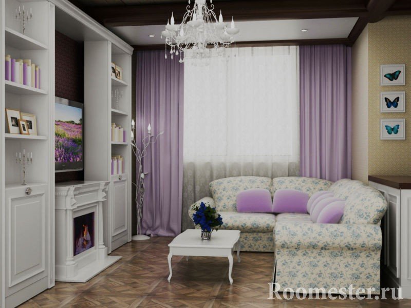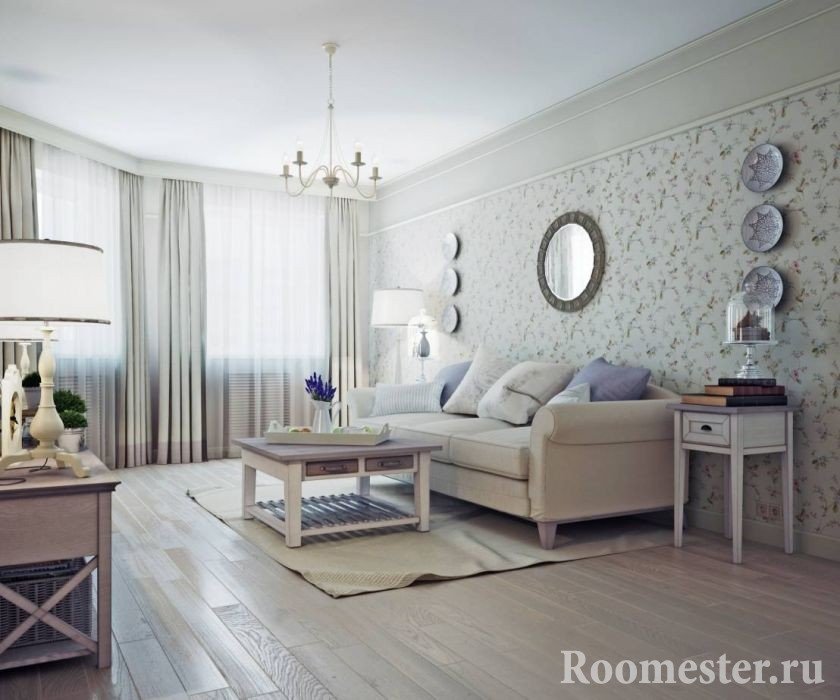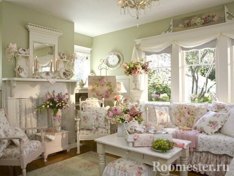 Ligereza y encanto, ternura y encanto: así es como se describe brevemente esta dirección de diseño. Las personas que lo prefieren son suaves y encantadoras, soñadoras y románticas. El diseño de la sala de estar se realiza en tonos claros y delicados, a menudo en tonos pastel. Los adornos usan flores, con menos frecuencia: una jaula o una tira.