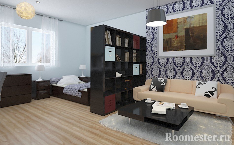 Si usa armarios altos, estantes o nichos, puede usarlos para separar el área de trabajo, por ejemplo, una biblioteca, estudio o rincón infantil. Los nichos de altura media (barra de bar) delimitan perfectamente el área de la cocina con un área de descanso. Además, los elementos de mobiliario en sí se utilizarán activamente aquí para su propósito previsto.