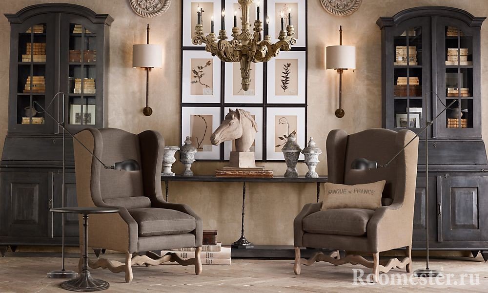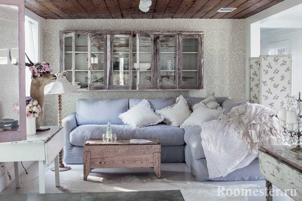 Los elementos de los muebles son simples, con formas clásicas estrictas. Necesariamente envejecido, vintage. Además, se pueden utilizar estructuras de ratán y elementos de forja. Textiles: exclusivamente de materiales naturales, naturales.Los accesorios son "antiguos", envejecidos, vintage.