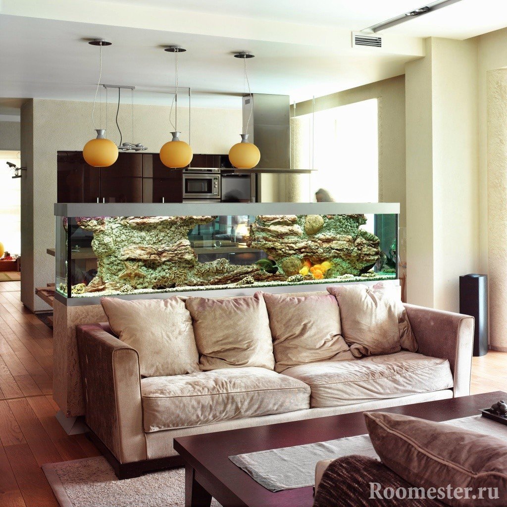 Los elementos divisorios de este grupo son estacionarios y se usan, a menudo en grandes áreas. Zonizan bien el espacio, le permiten completar el proyecto de diseño de la sala de estar de manera más brillante, originalmente. Y pueden convertirse fácilmente en una especie de "punto culminante" del interior. Especialmente si construyes en un acuario o una pantalla a color.