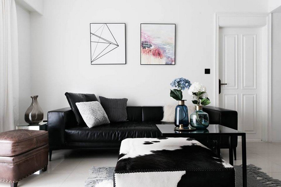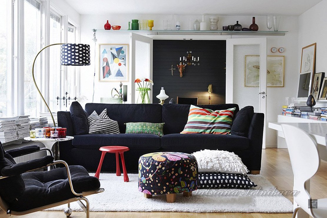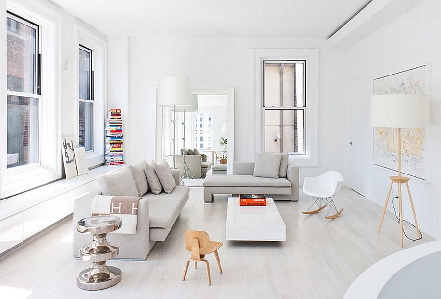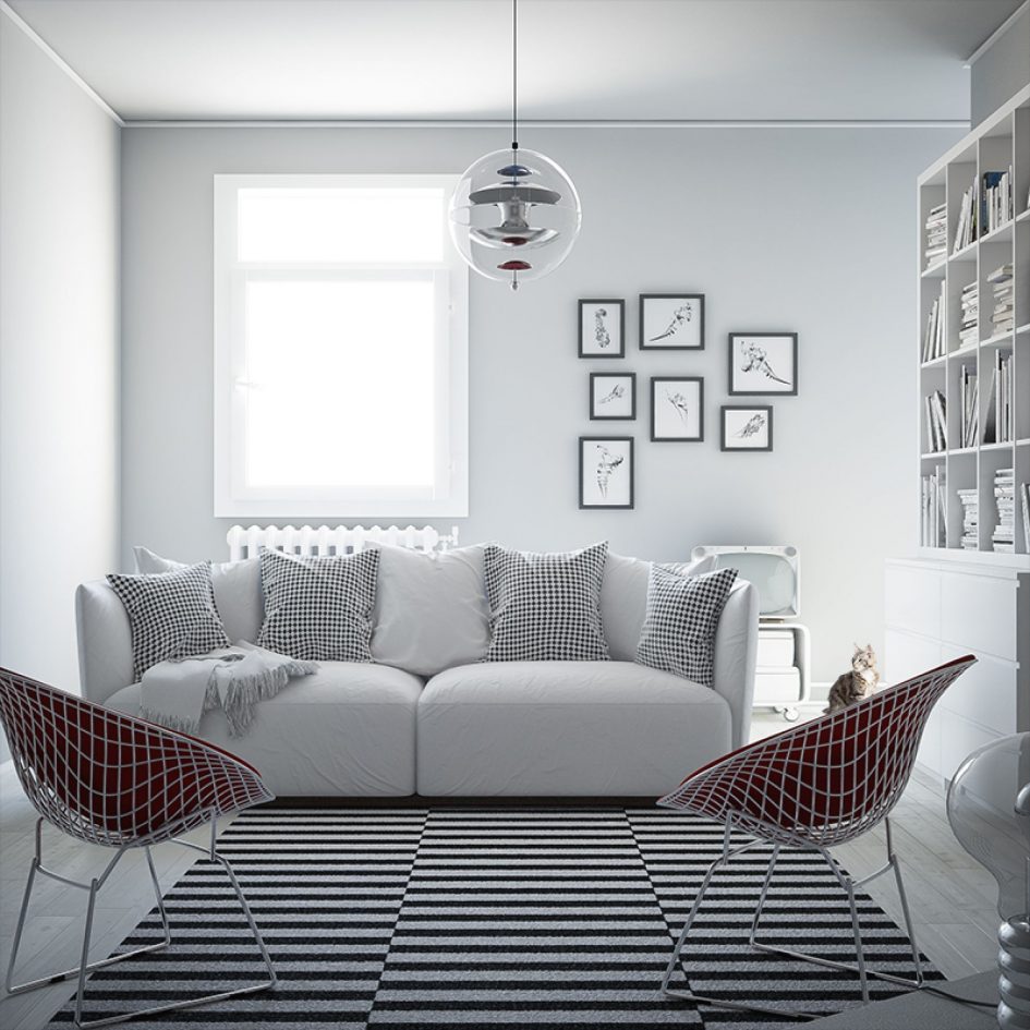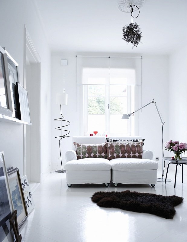La posibilidad de implementación en una sala de estar con cualquier área (debido al color blanco que prevalece en el interior, la presencia de buena iluminación, incluso una habitación pequeña se verá elegante y original).