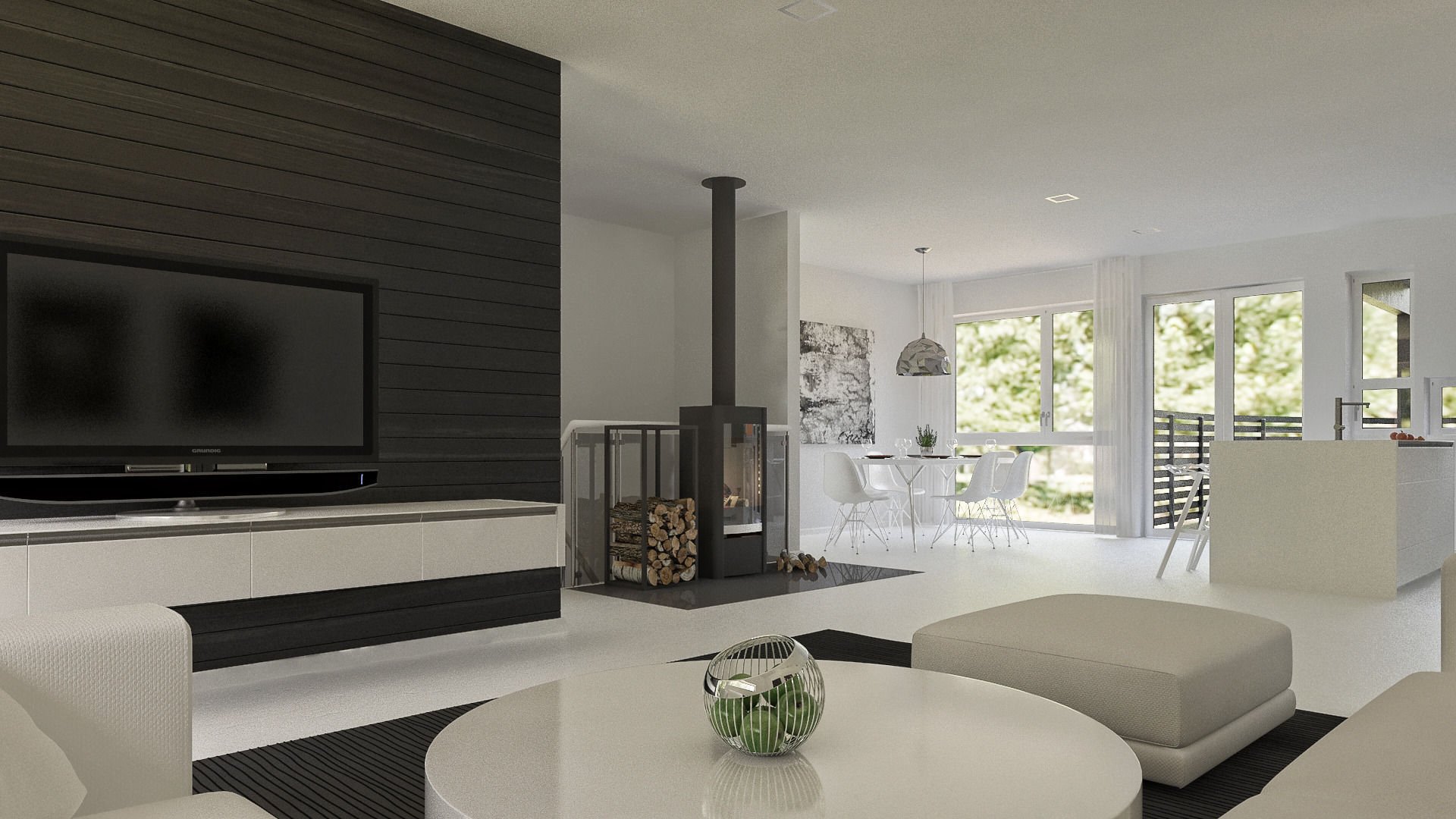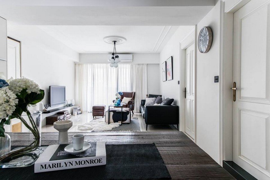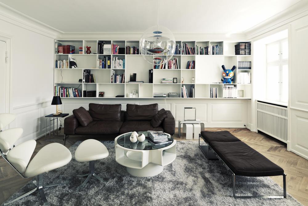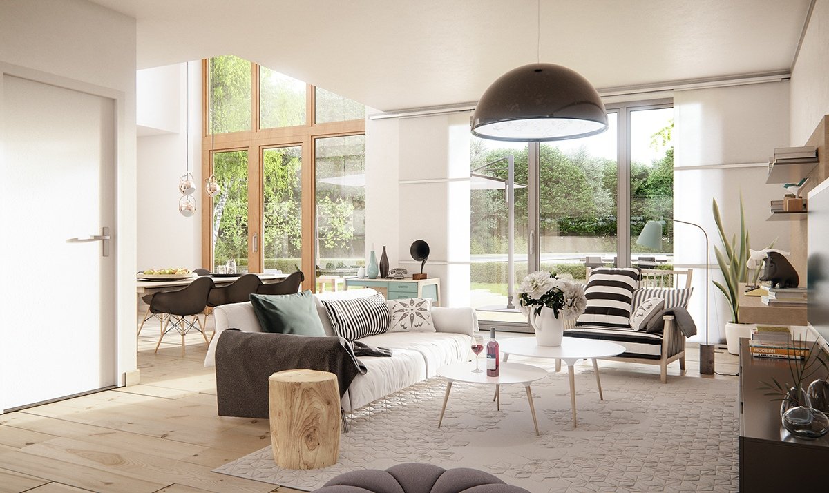 La posibilidad de implementación en una sala de estar con cualquier área (debido al color blanco que prevalece en el interior, la presencia de buena iluminación, incluso una habitación pequeña se verá elegante y original).