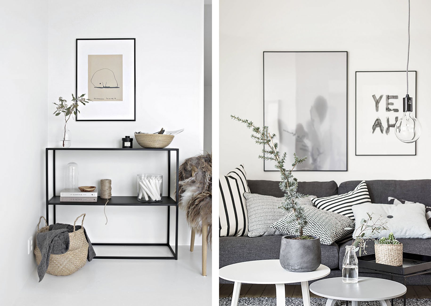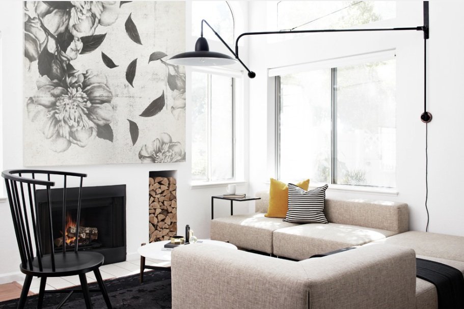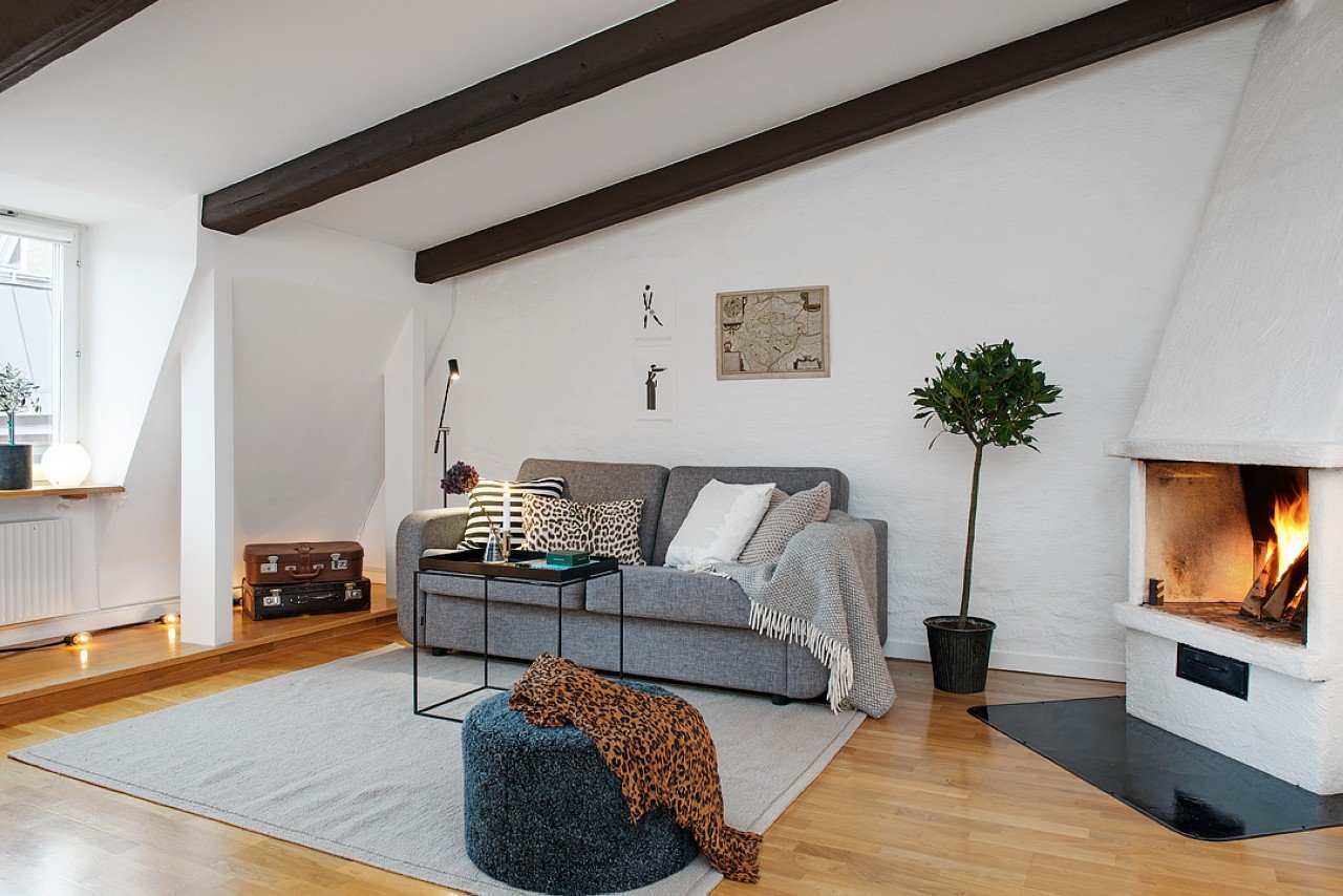 El elemento interior temático de la sala de estar escandinava puede ser una chimenea falsa o una chimenea eléctrica común. Por supuesto, en una casa de campo, los propietarios pueden diseñar una chimenea real, cerca de la cual pasarán su tiempo libre en familia en el invierno. Pero un modelo eléctrico elegante de color blanco o negro también será apropiado para mirar en el diseño general. En las paredes de los propietarios pueden colgar un par de pinturas con dibujos o inscripciones monocromas. Imágenes adecuadas de paisajes nevados de montaña. Complemente perfectamente esta decoración y cojines de sofá con adornos del norte o siluetas en blanco y negro de ciervos, montañas. Las cortinas se recomiendan en blanco o gris. Pueden ser pinturas largas en el piso o cortinas lisas enrolladas. Un par de plantas vivas verdes instaladas en el alféizar de la ventana, cerca de la entrada de la habitación, en la mesa de café, complementarán la dirección creada.