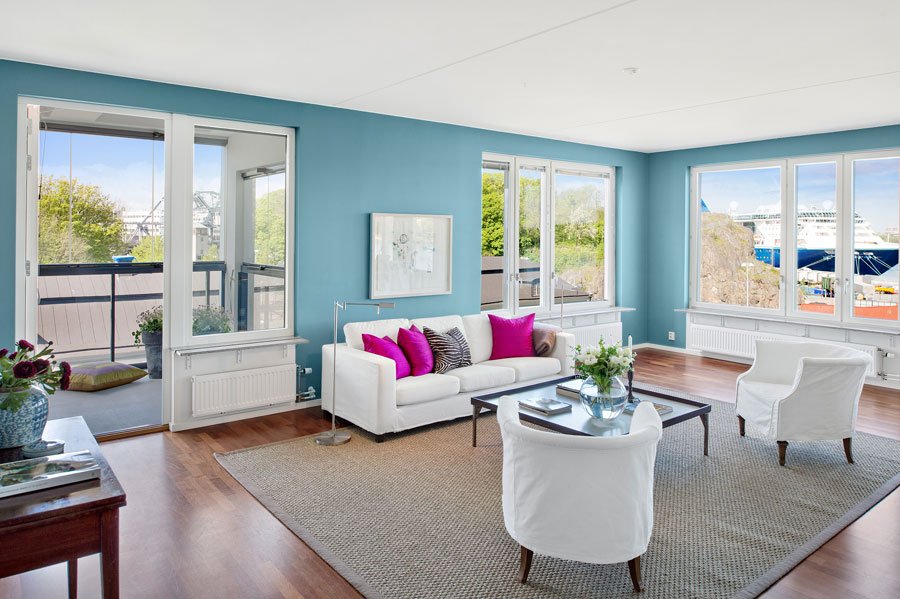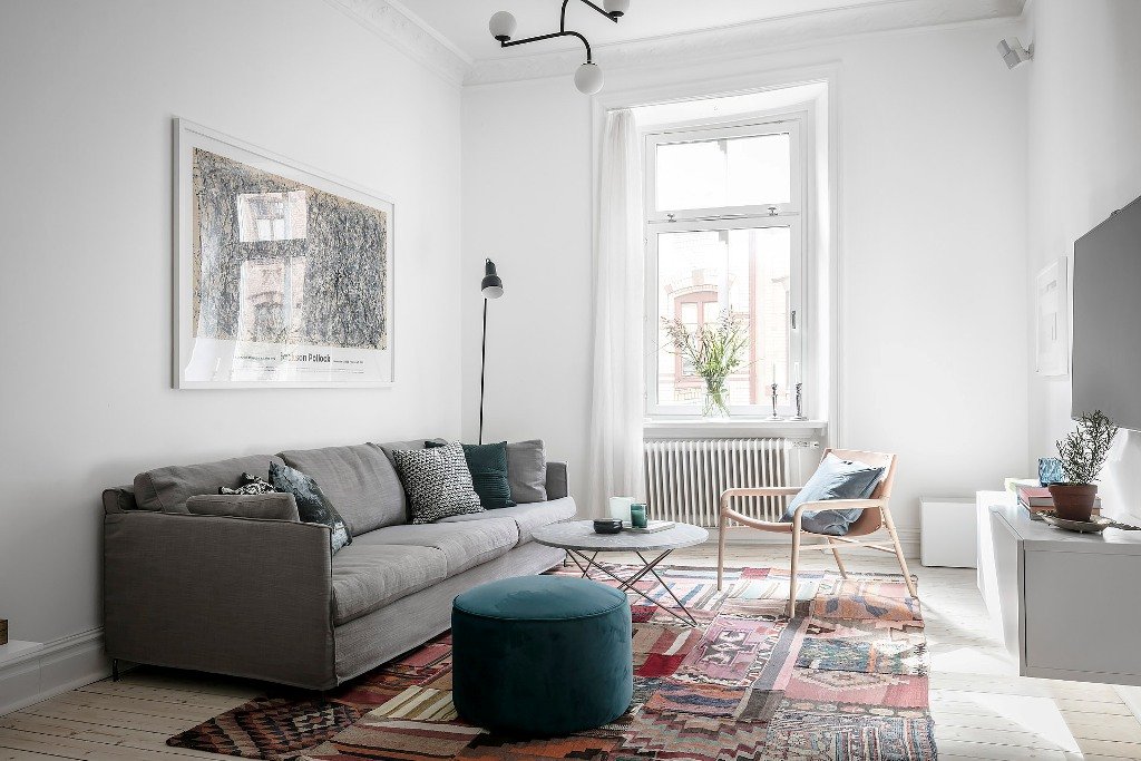 El estilo escandinavo está dominado por los colores característicos de la zona de ocurrencia de esta tendencia: Escandinavia (Suecia, Noruega, Dinamarca). El esquema de color principal debe ser blanco. En cantidades menores, se puede usar gris claro o marrón claro (el color de la madera aligerada). Las manchas oscuras (azul, negro) también ayudarán a enfatizar los tonos claros en el diseño. Los colores "brillantes" apropiados utilizados en la dirección se consideran mostaza oscura y turquesa oscura. Le permiten dar al interior general un aspecto inusual y hacerlo único.